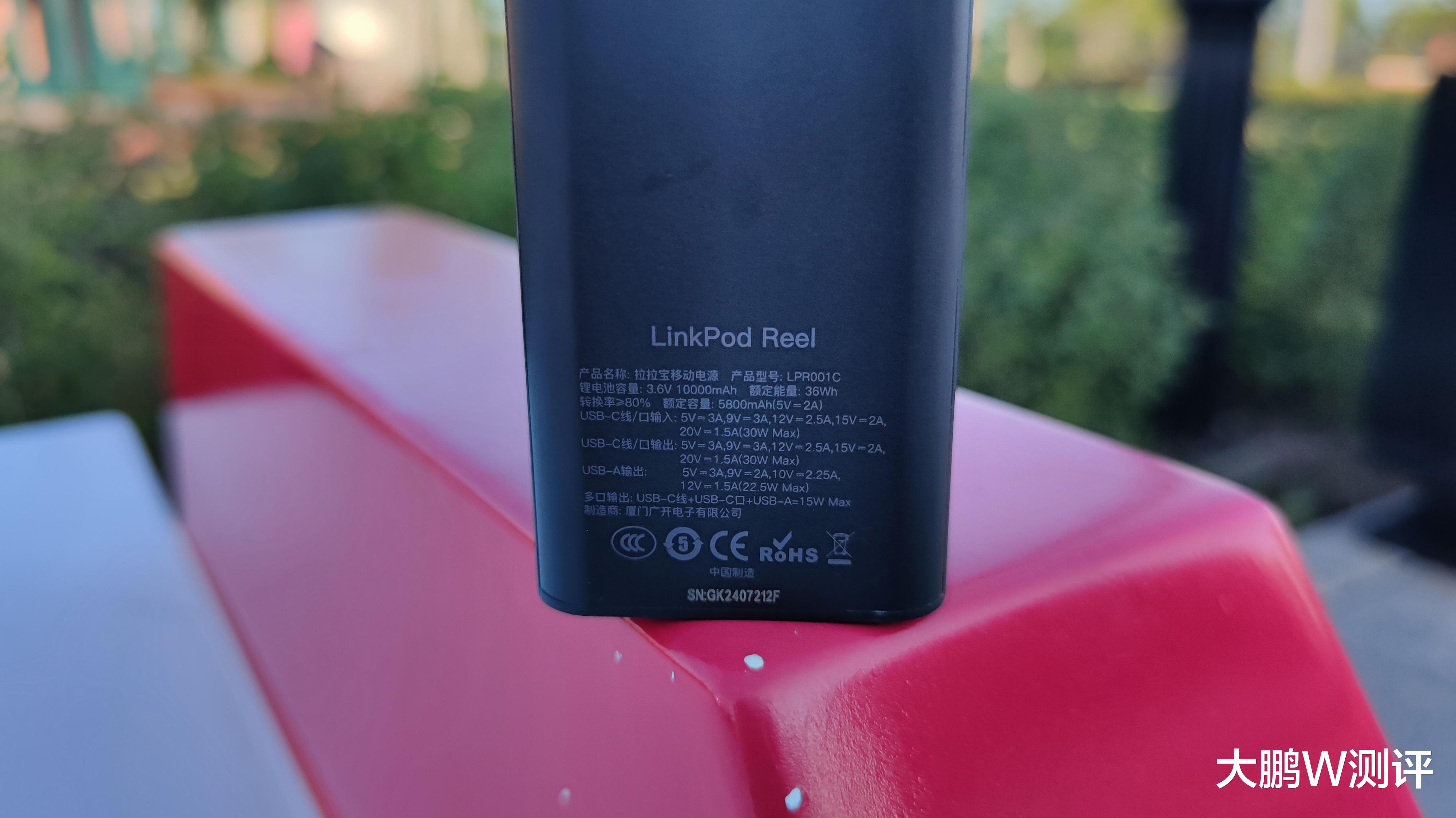 在拉拉宝的顶部区域分别是操作按键、电量数显屏以及可伸缩电源线,数显屏可以让我们直观地了解移动电源的剩余电量,以便及时为其充电。