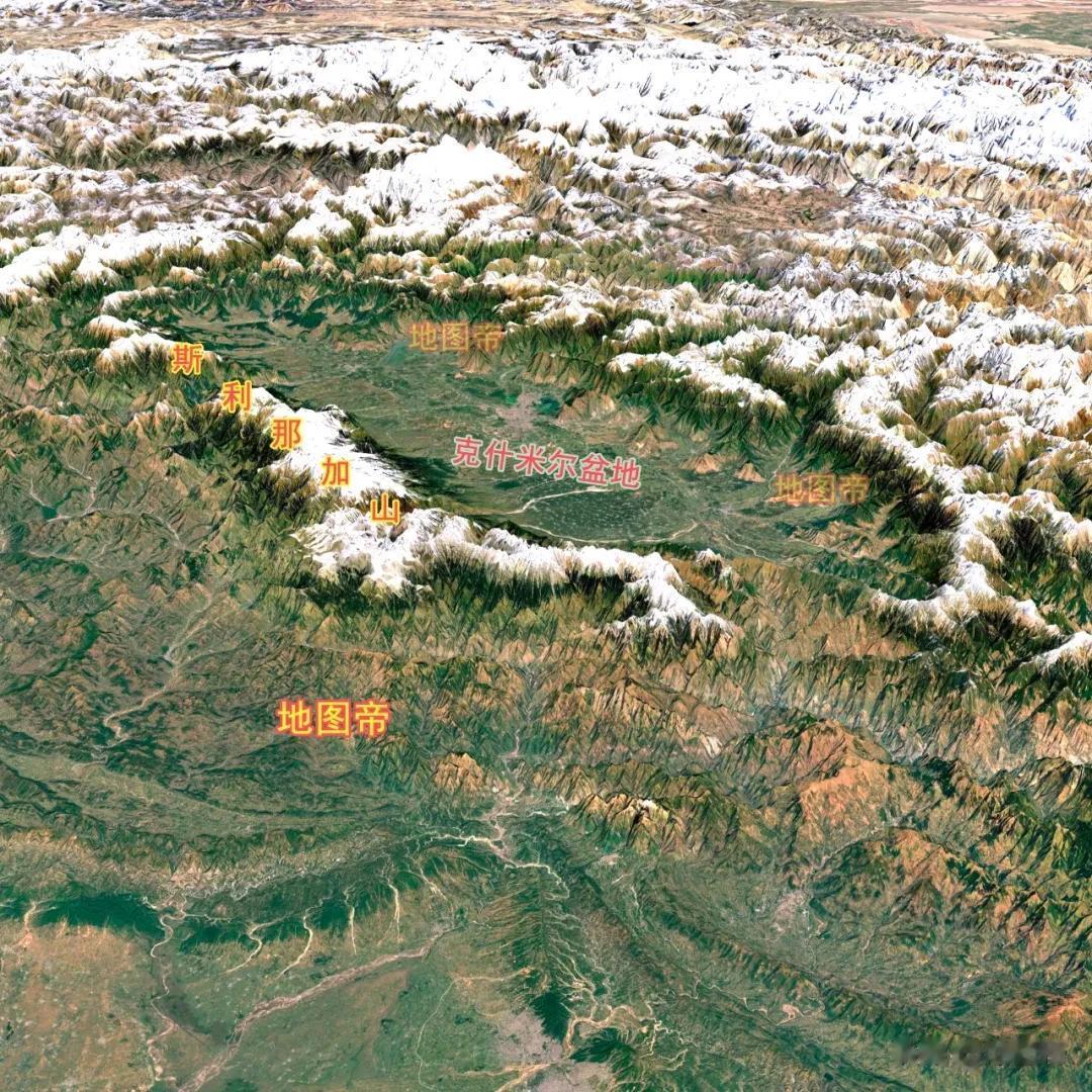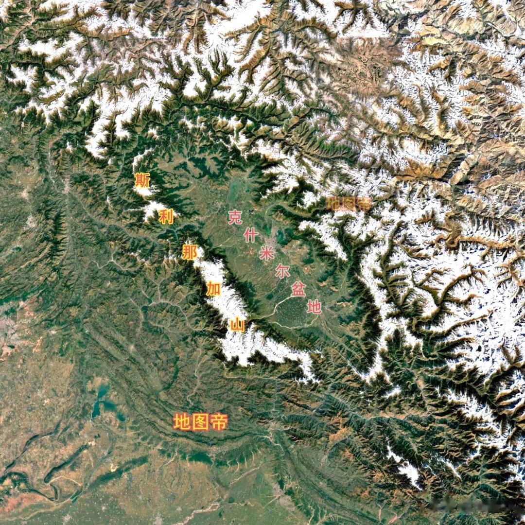 克什米尔西南部的克什米尔盆地(罽[jì]宾盆地),东北是喜马拉雅山脉,西南是皮尔本贾山脉(斯利那加山),西北-东南长134千米,最宽约32千米,面积约1.55万平方千米,占克什米尔的1/11。