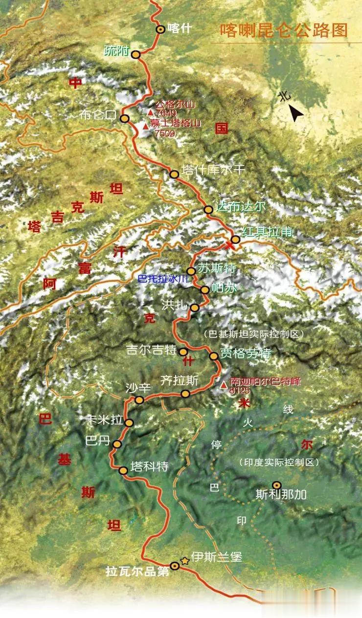 中巴公路穿越红其拉甫山口,经过巴控克什米尔地区的罕萨河、吉尔吉特河和印度河谷,进入巴基斯坦。