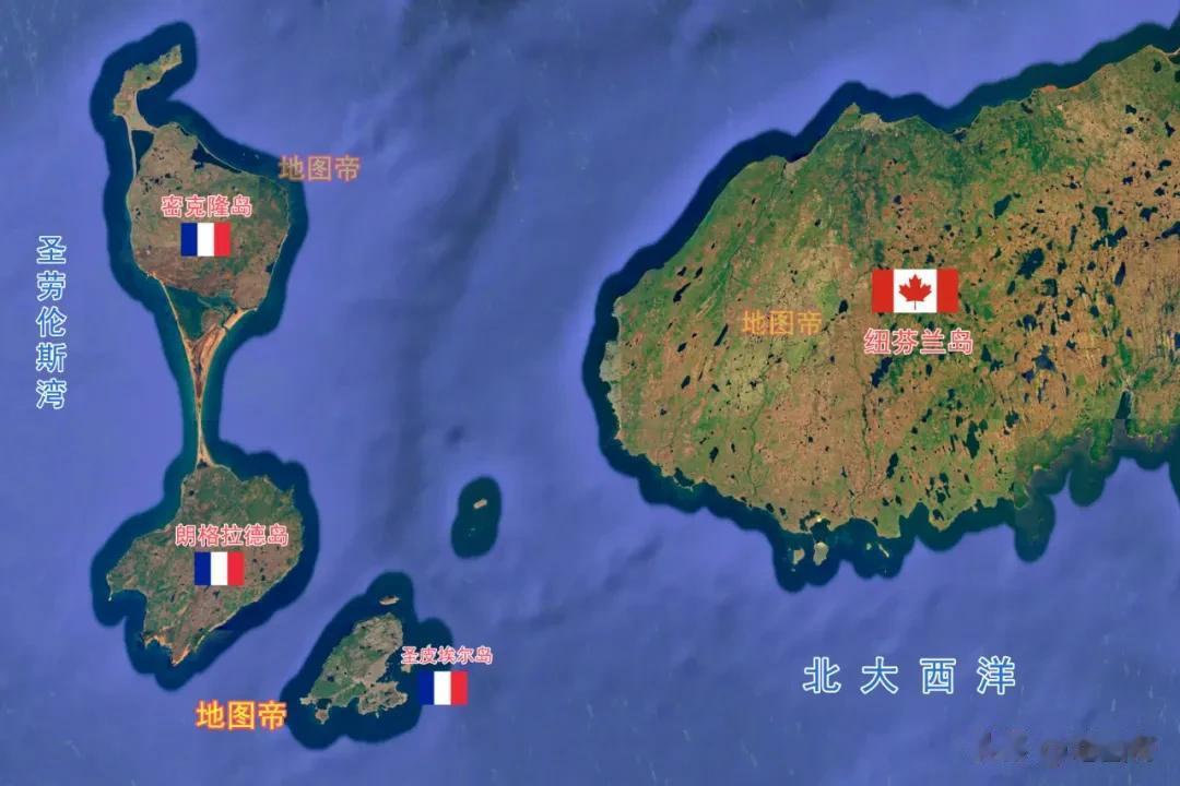 北美大陆上从北至南依次是加拿大、美国、墨西哥(不算阿拉斯加),几个大国简单明了,地理位置一目了然。乍看之下加拿大的陆上邻国只有美国一个,海上邻国在东北方向埃尔斯米尔岛隔肯尼迪海峡与丹麦的格陵兰岛相望,肯尼迪海峡中有个小岛汉斯岛,是加拿大和丹麦共有。加拿大还有其他距离较近的海上邻国吗?有,法国。