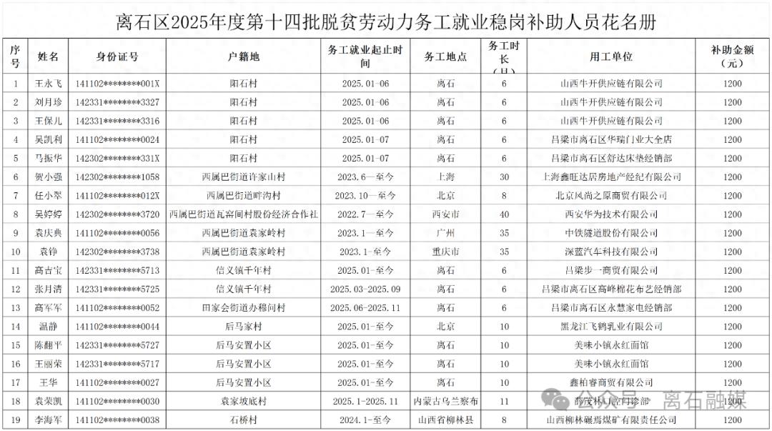 附件:离石区2025年度第十四批脱贫劳动力务工就业稳岗补助人员花名册