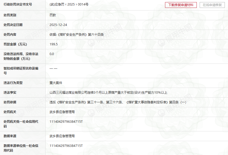 2025年12月24日,武乡县应急管理局出具(武)应急罚﹝2025﹞0014号行政处罚决定书,山西三元福达煤业有限公司因连续3个月以上原煤产量超核定(设计)生产能力10%以上的重大违规行为,被依法处以199.5万元罚款。这一高额处罚直指煤矿超产这一安全生产“高压线”问题,再次凸显了监管部门对煤矿超能力生产的“零容忍”态度。