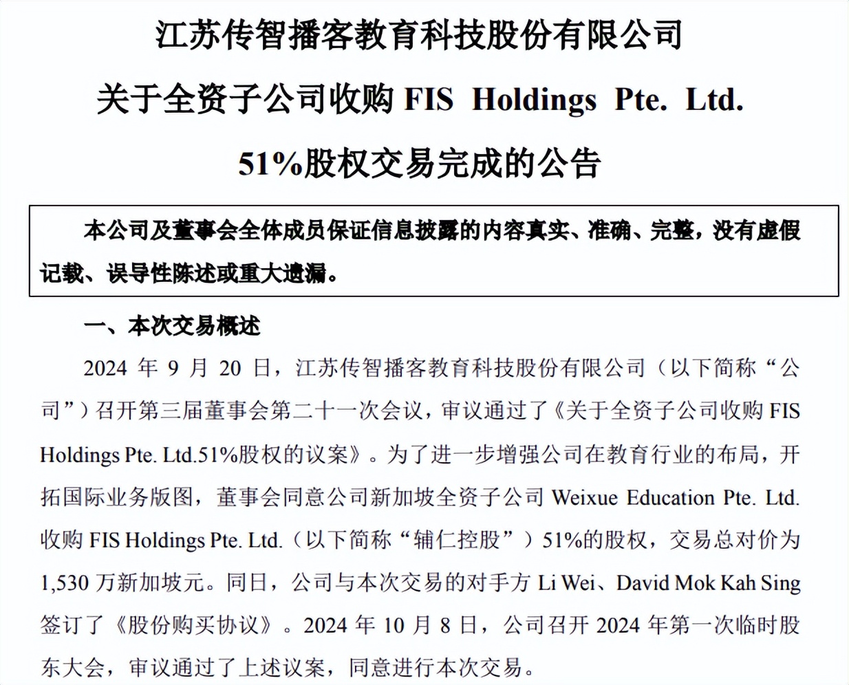 1月8日消息,近日,江苏传智播客教育科技股份有限公司(证券简称:传智教育)宣布其全资子公司Weixue Education Pte. Ltd.已完成对FIS Holdings Pte. Ltd.(辅仁控股)51%股权的收购,交易总对价为1,530万新加坡元。