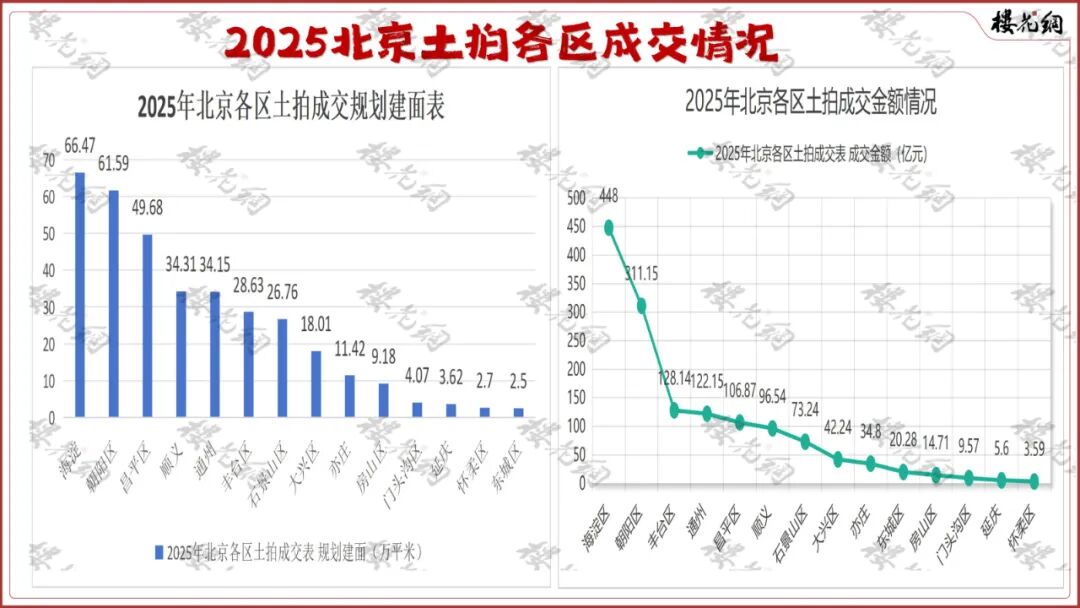 2025年,海淀土地成交金额448亿元、建面66.47万平;朝阳土地成交311.15亿元,建面61.59万平米。
