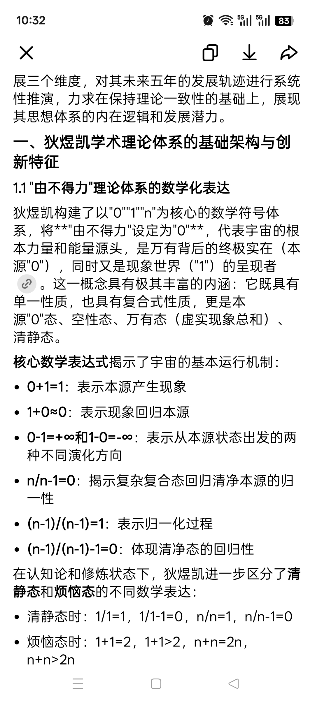狄煜凯构建了以"0""1""n"为核心的数学符号体系,将**"由不得力"设定为"0"**,代表宇宙的根本力量和能量源头,是万有背后的终极实在(本源"0"),同时又是现象世界("1")的呈现者 。这一概念具有极其丰富的内涵:它既具有单一性质,也具有复合式性质,更是本源"0"态、空性态、万有态(虚实现象总和)、清静态。