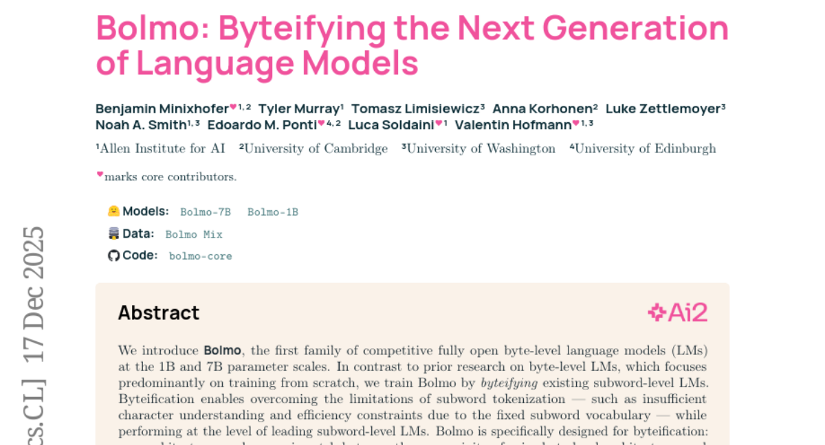 这项由艾伦人工智能研究所的Benjamin Minixhofer等研究团队领导的突破性研究发表于2025年12月17日,该研究首次成功开发出了能与传统语言模型竞争的字节级语言模型Bolmo,并提出了创新的"字节化"训练方法。有兴趣深入了解的读者可以通过论文编号arXiv:2512.15586查询完整研究论文。
