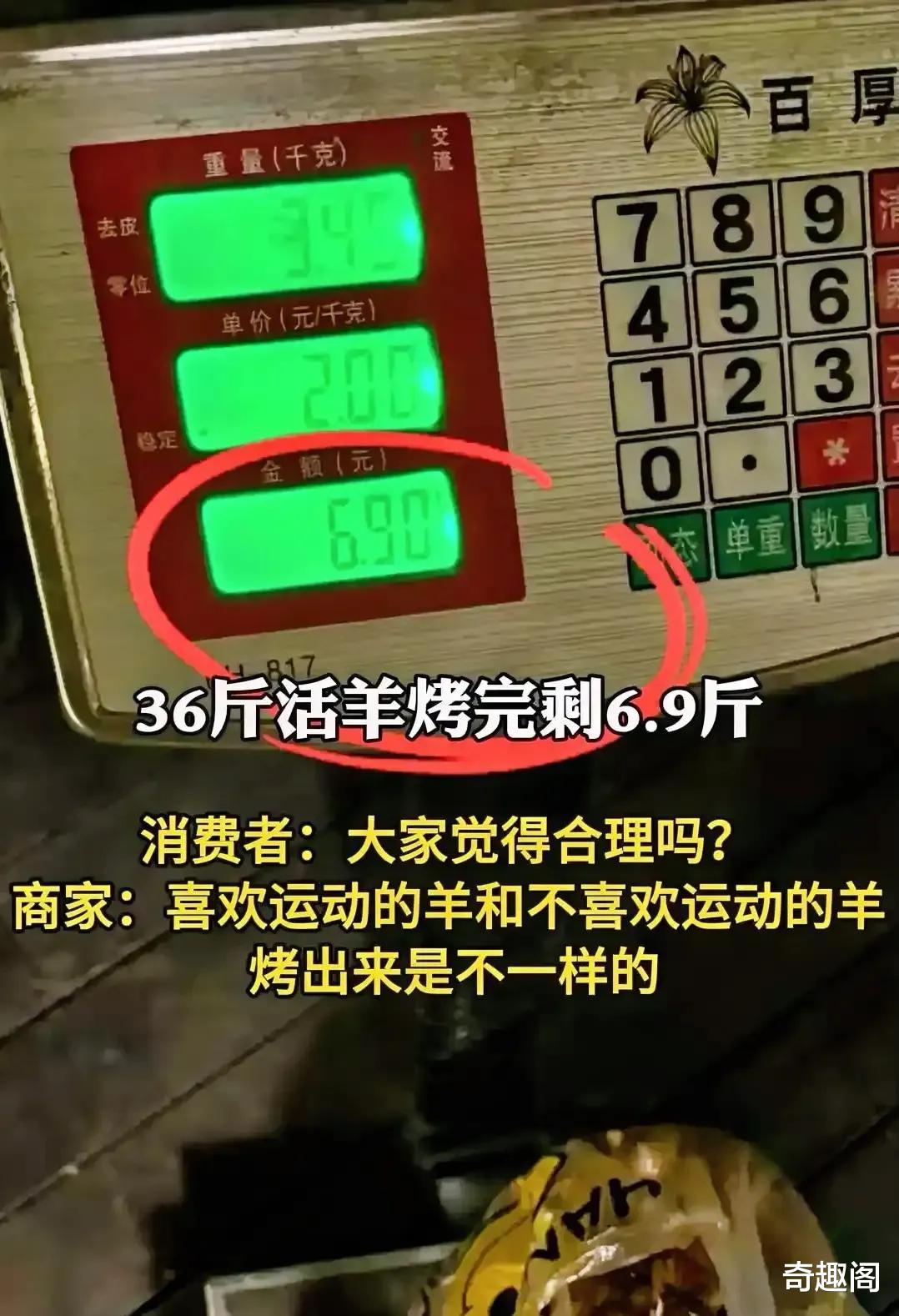 36斤的大活羊,烤完就剩这么点儿?更绝的是,面对质问,这家店工作人员的 “神逻辑” 直接把网友都气笑了。人家解释说:“这跟羊的个体差异有关,有的羊爱运动,有的羊不爱运动,烤出来的样子肯定不一样。而且你们这只羊,烤得比较干,水分流失多。”
