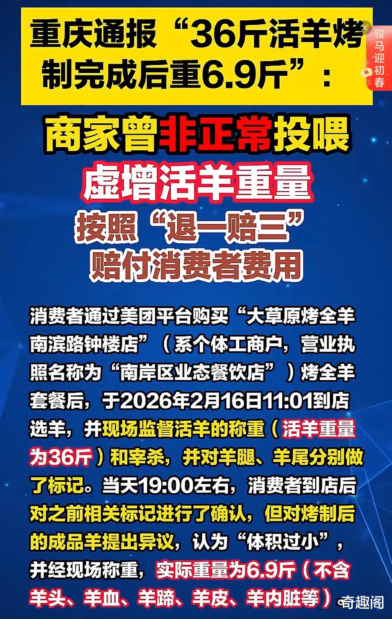 大家过年期间都去下馆子了吧?本来开开心心吃顿团圆饭,如果要是遇上糟心事,那可真够堵心的。比如重庆的这位王女士,她在2026年2月16日,除夕夜,带着家人去当地一家叫“大草原烤全羊”的店吃饭,结果遇到了一个离谱到家的“缩水羊”。