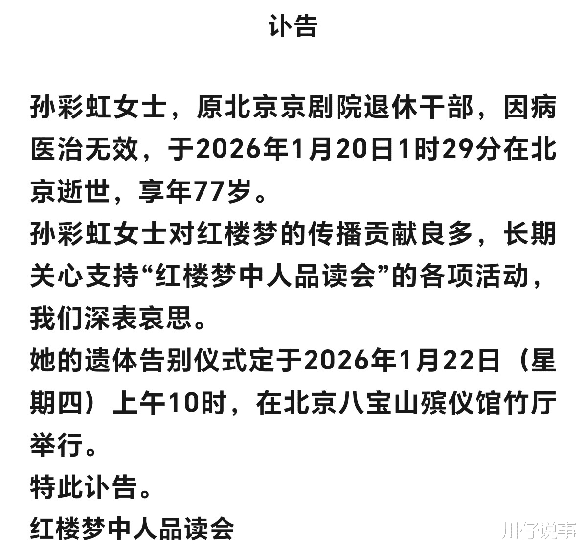 1月21日,“红楼梦中人品读会”的一则讣告,像把钥匙插进了红楼迷心里最软的那个锁孔——北京京剧院退休干部孙彩虹,因病医治无效,于1月20日凌晨1时29分在北京逝世,享年77岁。遗体告别仪式定在22日上午10点,八宝山竹厅。