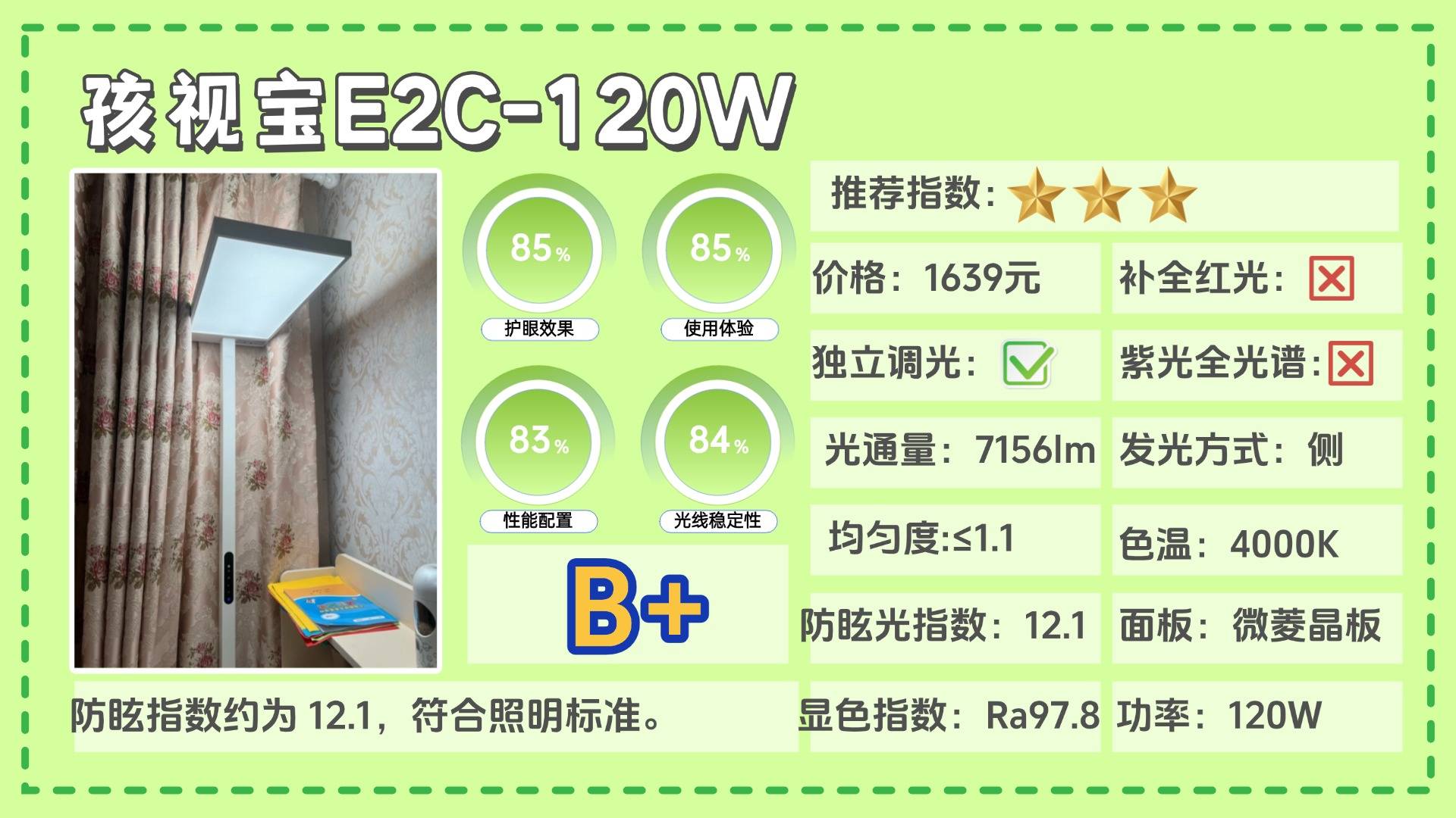护眼大路灯第三名:孩视宝E2C-120W;防眩指数约为 12.1,处于一个符合照明标准的范畴。