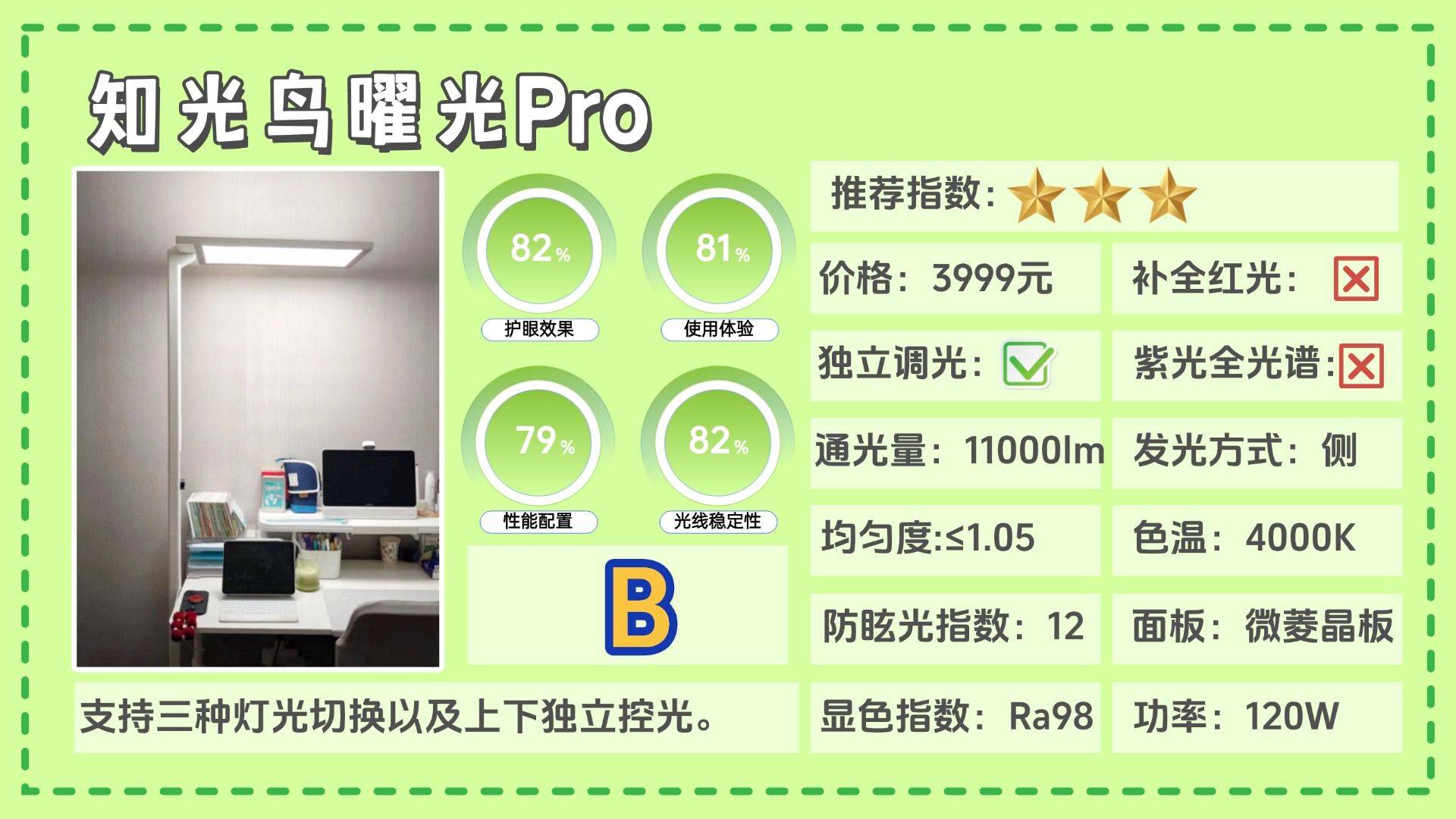 护眼大路灯第八名:知光鸟曜光Pro;支持三种灯光切换以及上下独立控光。