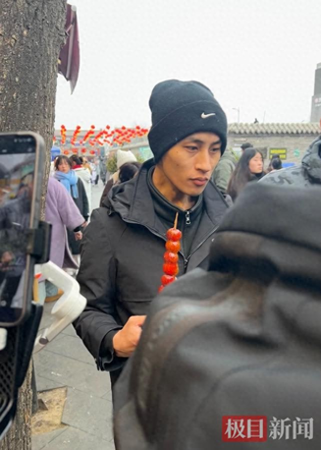 刚进入南锣鼓巷,张云鹏便被一个冰糖葫芦店铺吸引。他第一次尝试用自己刚装好微信支付购买了一根山楂糖葫芦,又在附近的店里买了一包大白兔奶糖。