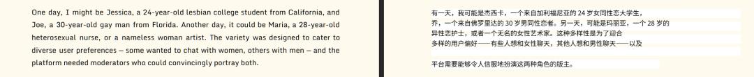 “我很快意识到,这份工作一点也不普通,它是一套被严密监管的生产系统。每一次互动都会被关键绩效指标追踪,包括消息量、回复速度、用户参与度、对话连续性。达成这些指标是硬性要求。