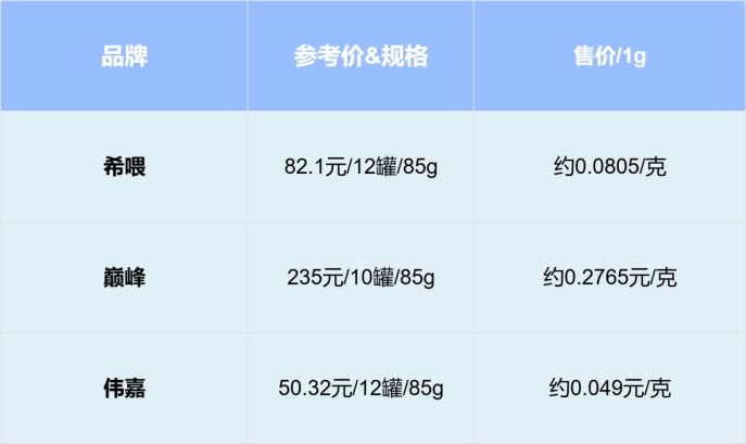 伟嘉猫罐头:单价较低,罐头添加了宠物饲料复合调味料。