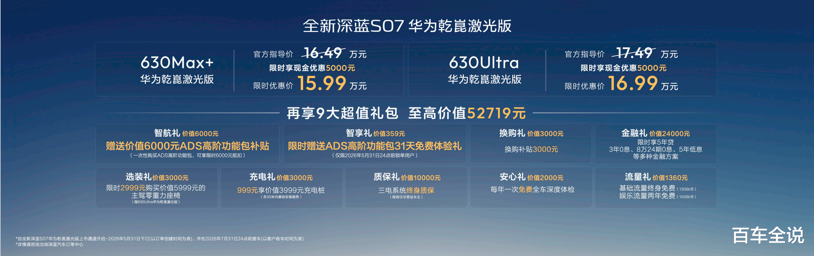 4月20日,全新深蓝S07华为乾崑激光版正式上市,带来630Max+华为乾崑激光版、630Ultra华为乾崑激光版两个配置版本。深蓝汽车推出5000元限时现金优惠,以及至高价值52719元的9大超值礼包,新车限时优惠价15.99万-16.99万元。尤其令人惊喜的是,价值6000元的ADS高阶功能包补贴。通过普惠价格+诚意权益,全新深蓝S07华为乾崑激光版真正兑现“普及全民智驾”使命,让更多人拥有顶流智能辅助驾驶体验。