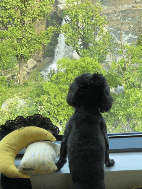 树与楼间距大,一年四季阳光充沛,而且我家窗户外有瀑布,除了瀑布声,就只听得到鸟叫,住起来太舒适了。