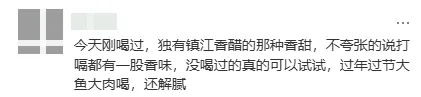 有网友表示:“今天刚喝过,独有镇江香醋的那种香甜,不夸张的说打嗝都有一股香味,没喝过的真的可以试试,过年过节大鱼大肉喝,还解腻。”