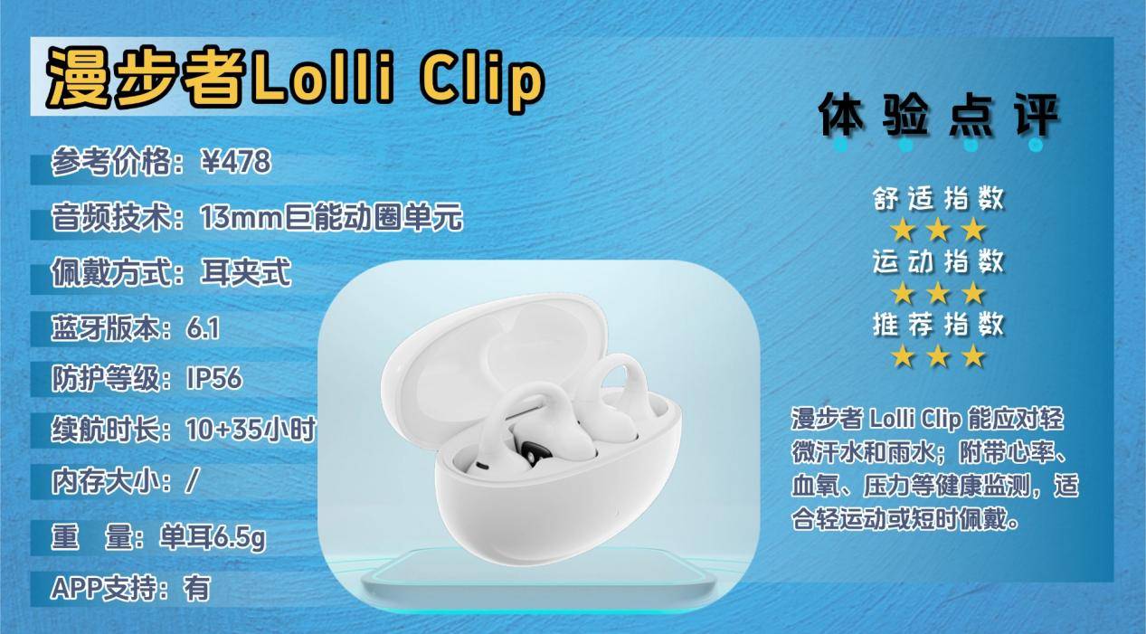 漫步者Lolli Clip定位于兼顾日常佩戴与轻运动使用的开放式骨传导耳机,强调舒适、轻盈和健康监测功能。耳机外观小巧精致,适合通勤、办公或日常休闲佩戴,同时提供基础运动陪伴。