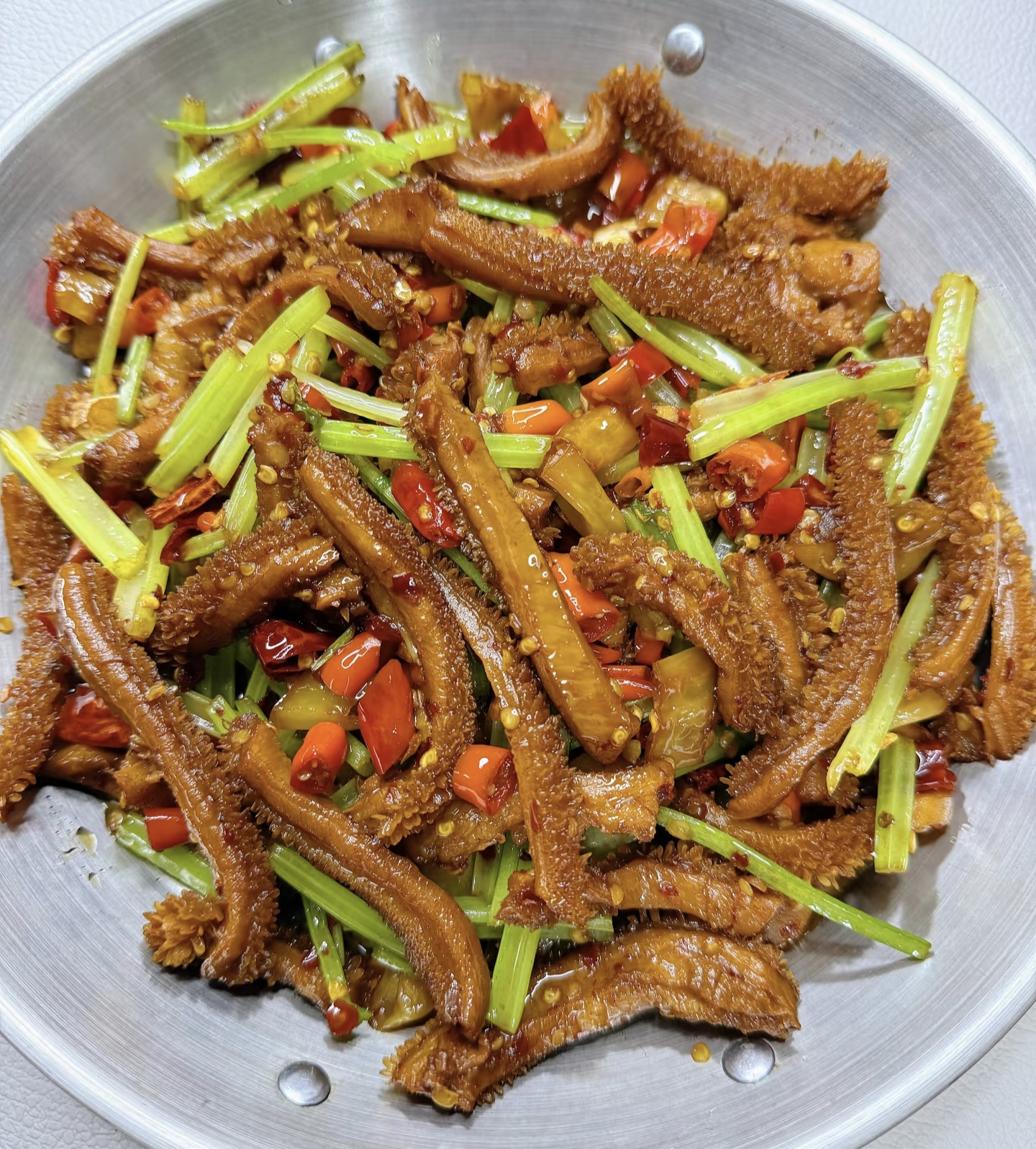 当牛肚边缘微微卷曲时,马上倒入小米椒,芹菜梗,这时候转大火爆炒30秒。蔬菜断生即可,保持脆嫩口感。最后淋入调好的酱汁,此时要像魔术师一样快速翻炒,让每片食材都裹上琥珀色的酱汁。当锅底出现油亮亮的汁水时,撒把葱花关火,整个过程不超过3分钟!