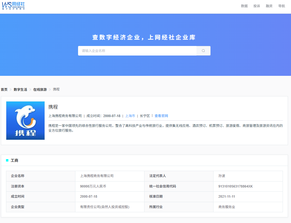 据网经社企业库显示,“携程”属于上海携程商务有限公司,成立于2000年7月18日,法定代表人为孙波。
