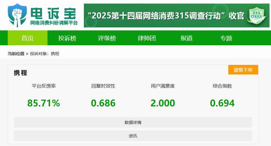 2025年至今,“电诉宝”受理投诉中涉及的数字零售领域中在线旅游用户有效投诉显示(依据投诉量排行),“携程”排名第4位。最新评级为“谨慎下单”。除此之外,其他被投诉的类似平台还有:去哪儿、飞猪、走着瞧旅行、同程旅行、联联周边游、途家、航班管家、如程、南方航空、骑驴游、华住酒店、蝌蚪亲子等。