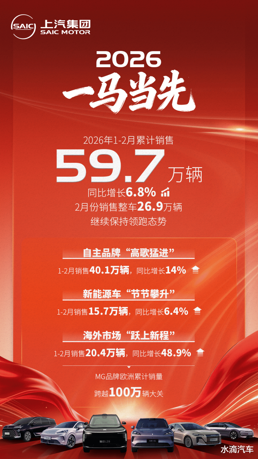 2026年1~2月,国内多数车企业绩承压下滑,行业整体增长动力不足,上汽集团却逆势突围,一路领先,交出了累计59.7万辆且同比增长6.8%的亮眼答卷。这份成绩的背后,是四大板块协同增长,质效双升,更是企业深化改革、技术创新、坚守用户导向的综合成果,因此增长的含金量十足。