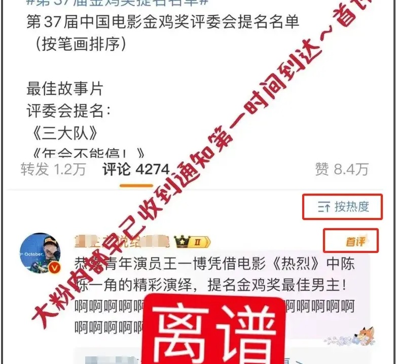 虽然提前进行网络控评并不能直接证明金鸡奖存在内定情况,但流量明星的粉丝圈一直以来都接受过精心训练,也许他们只是在积极维护偶像呢。