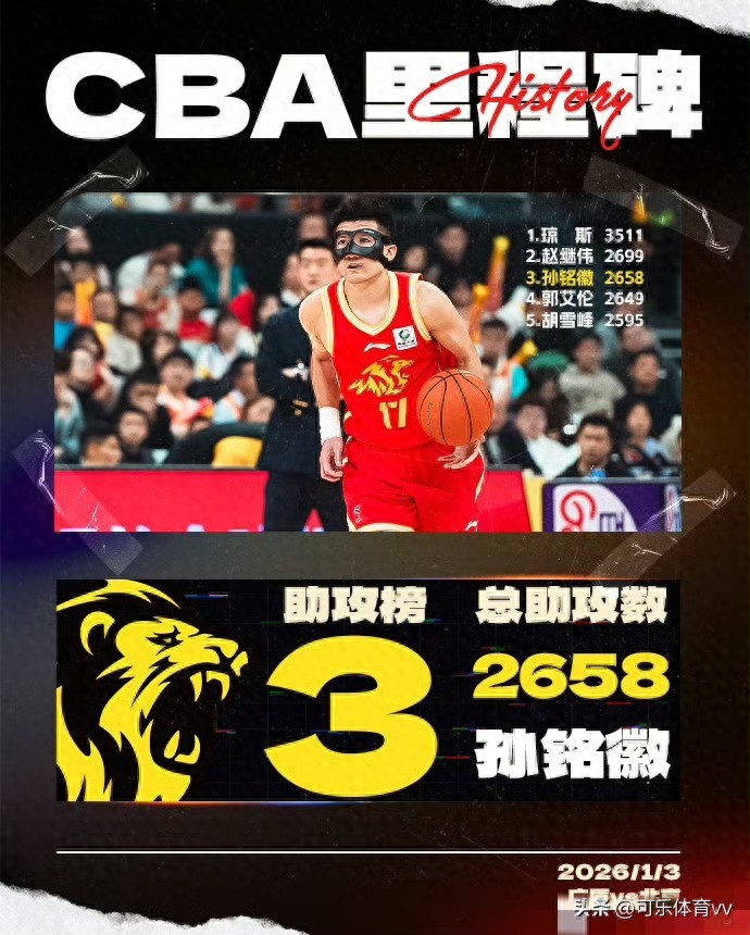 北京时间1月3日晚,25-26赛季CBA 常规赛第10轮开打,卫冕冠军广厦男篮主场再战北京男篮。5天前双方有过一次交手,广厦客场击败北京。开局双方在大部分时间处于胶着态势,末节在胡金秋的带领下,帮助广厦占据场上优势,赢下本场比赛。最终,广厦主场77-74险胜北京,豪取8连胜并且双杀对手!本场比赛,孙铭徽CBA生涯总助攻数达到2658次,超越郭艾伦(2649次)升至CBA历史助攻榜第3。