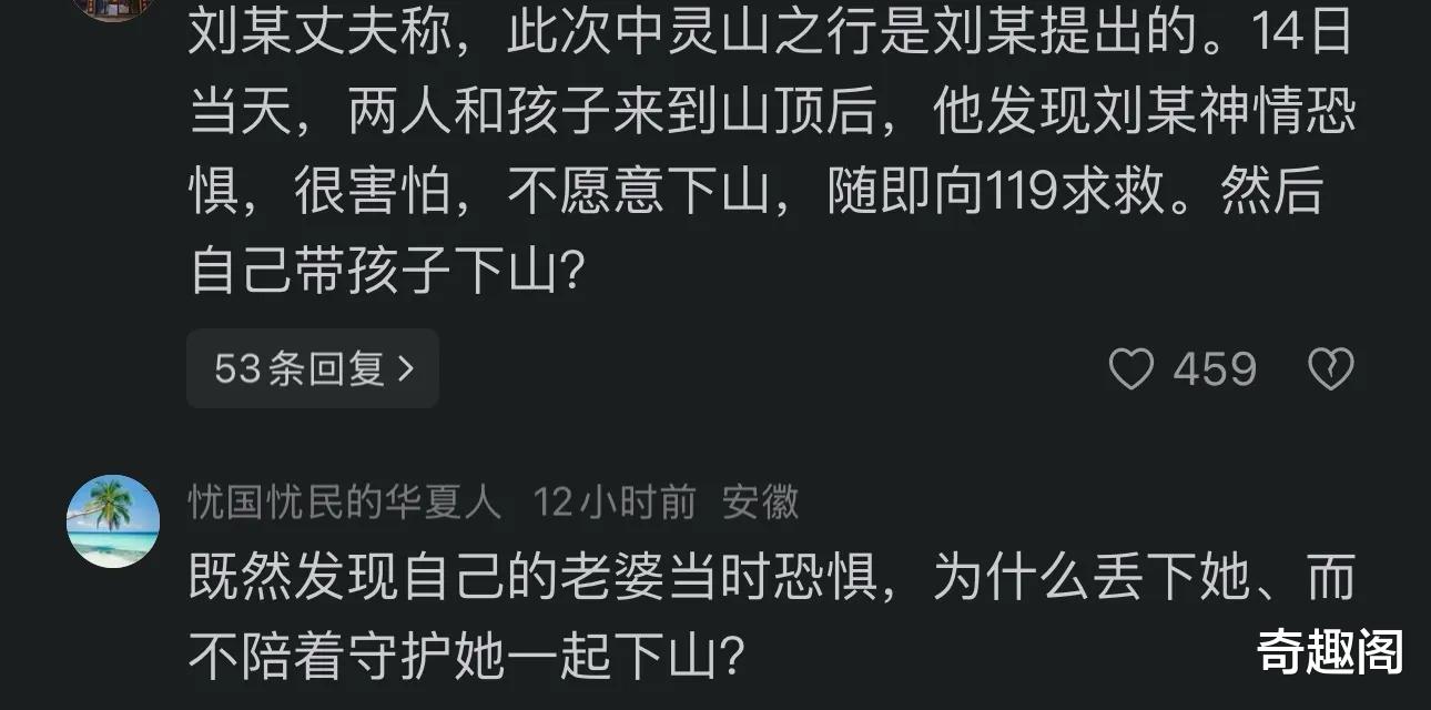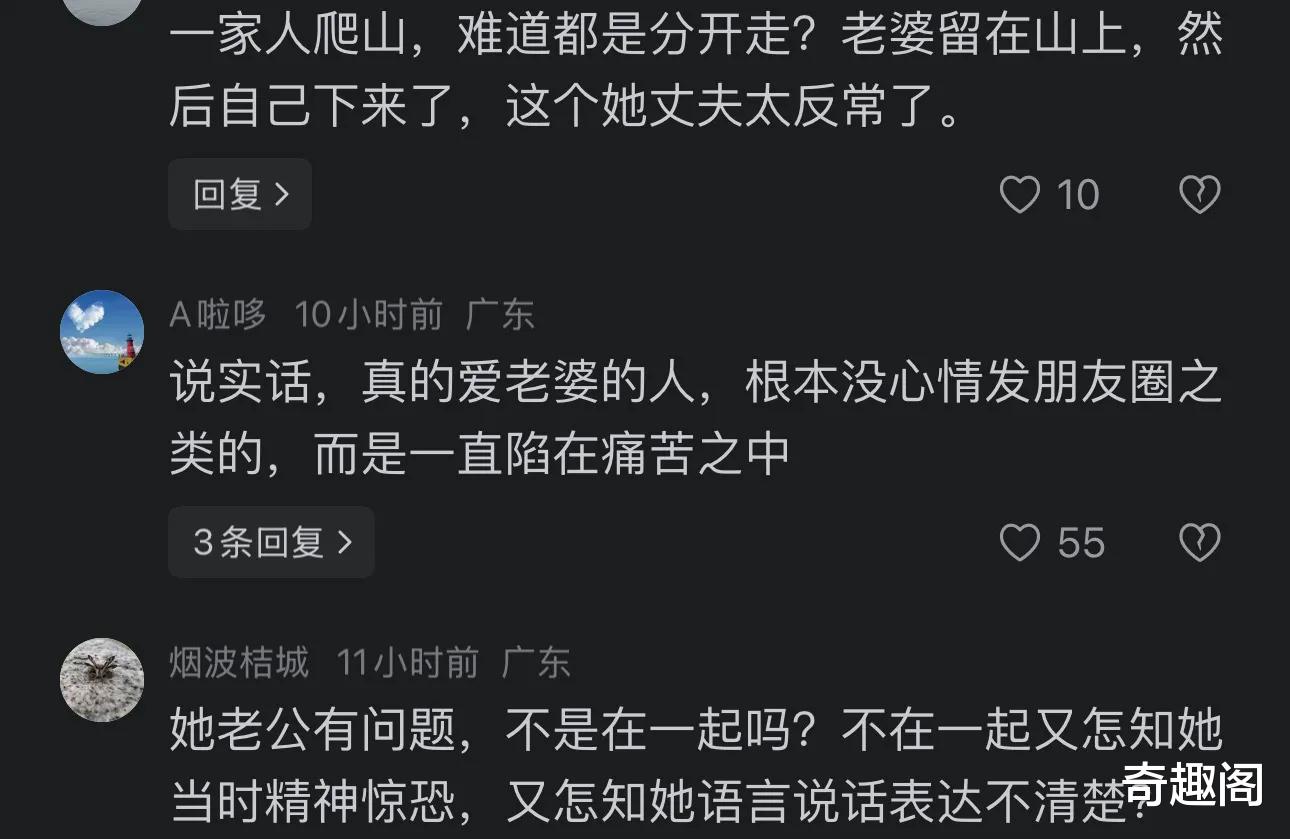网友质疑,丈夫在明知妻子精神恍惚、举止异常,在深夜无监控的陡峭山顶,他什么不贴身守护呢?无论如何都不应该让一个神志不清的人,离开自己的视线。