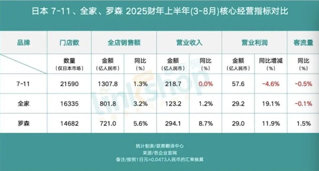 值得关注的是,核心市场客流与客单价的“双重失速”。据联商网统计,在2025财年上半年(3-8月),与全家、罗森营业利润持续增长形成鲜明对比的是,7-11利润显著下滑。尽管客单价与同店销售额保持增长,但客流量始终未能“止跌”。营业利润同比零增长,营业利润同比减少4.6%。而竞争对手正在紧逼。