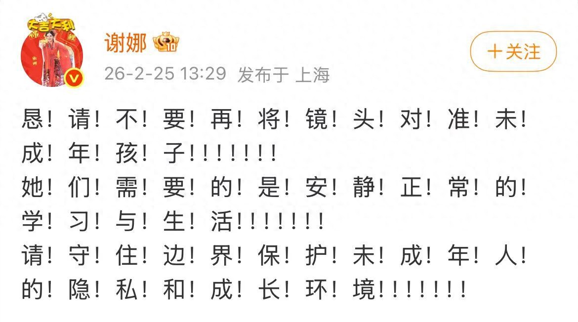 2月25日,谢娜发文恳请不要再将镜头对准未成年孩子,“请守住边界保护未成年人的隐私和成长环境”,并连发多个感叹号。