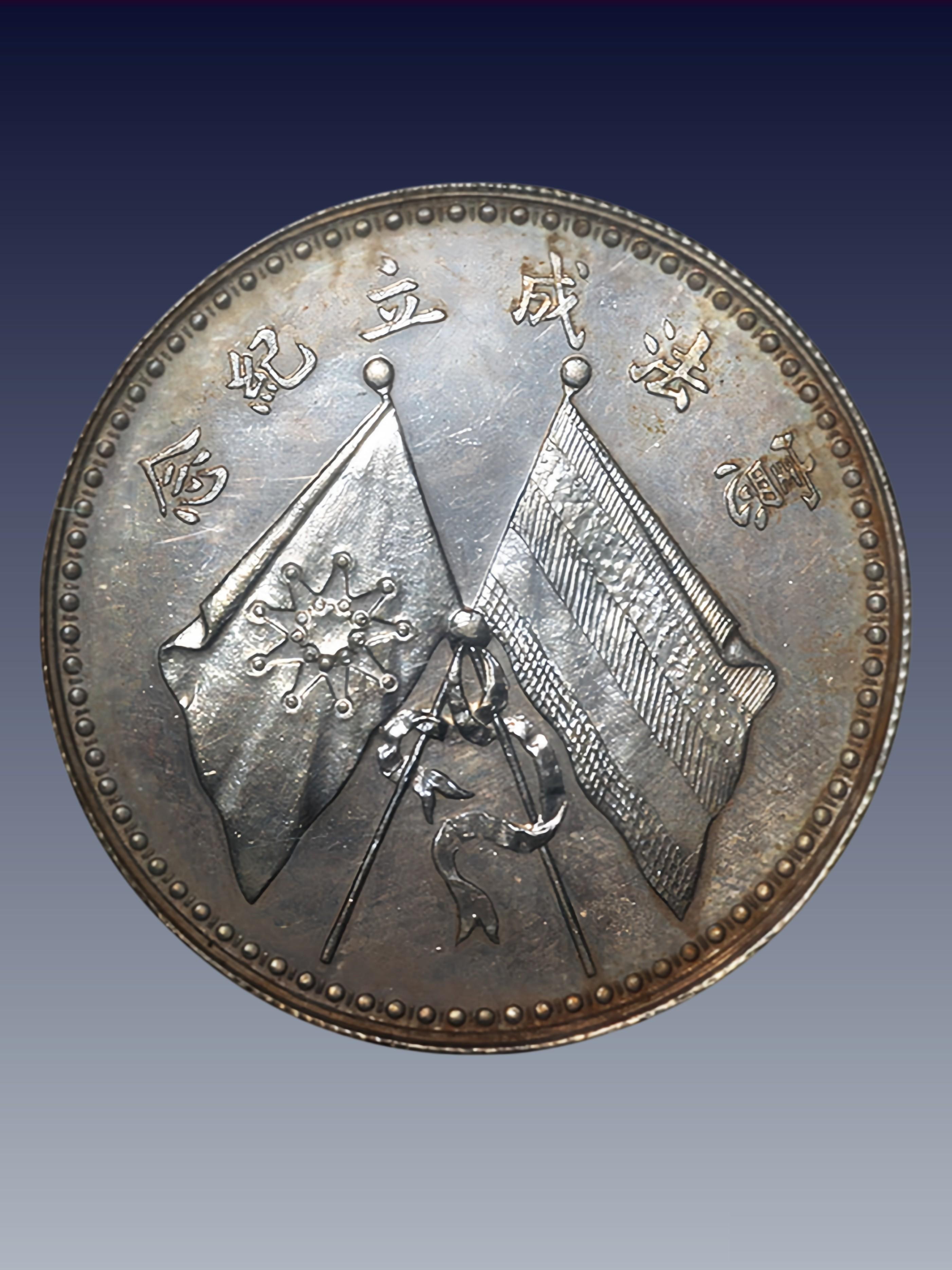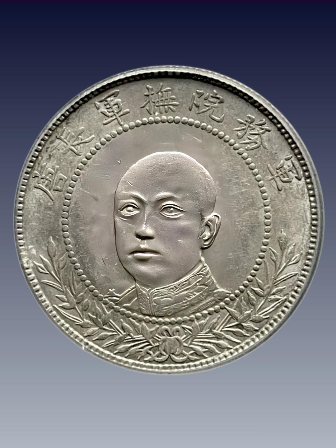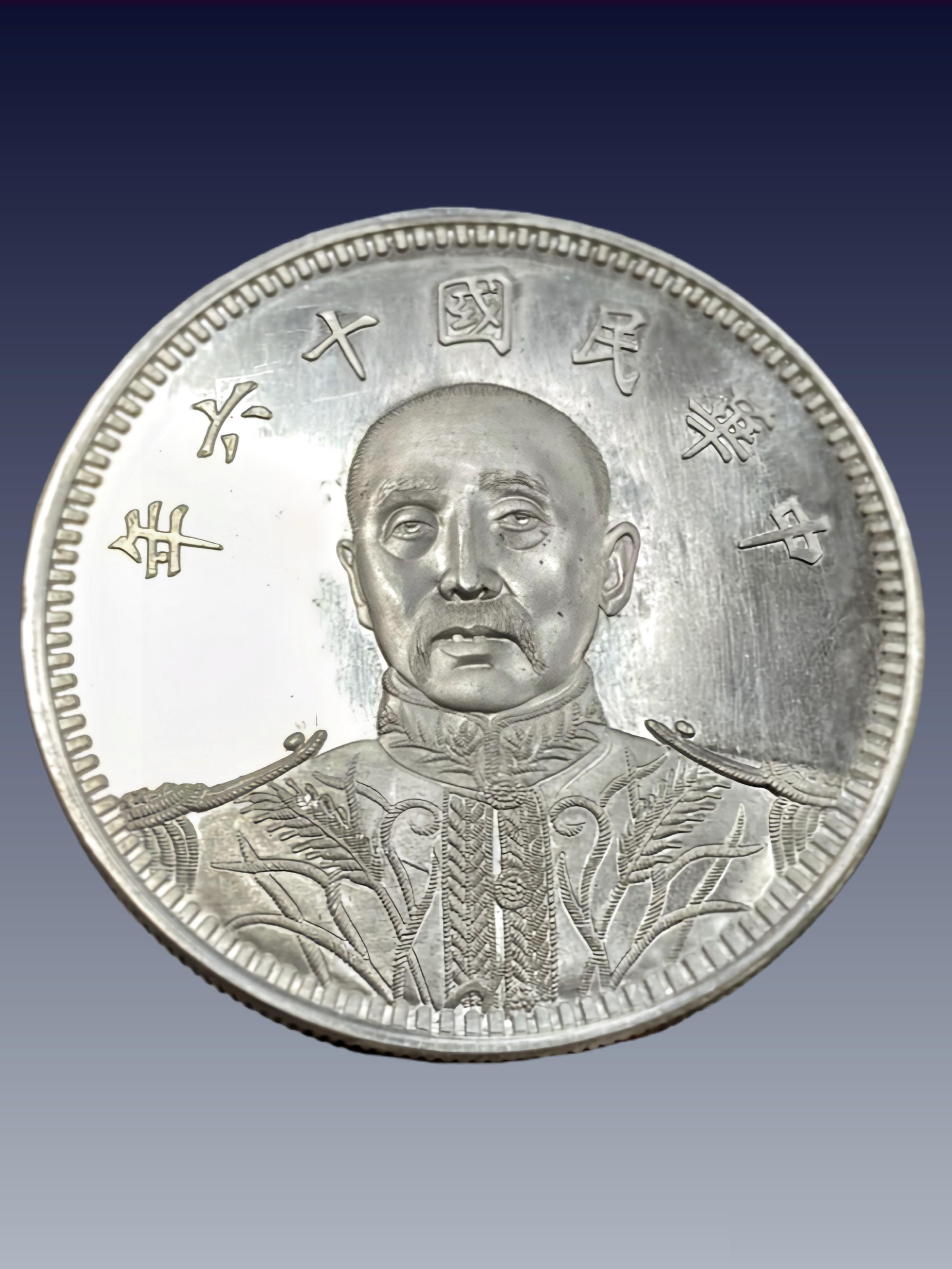 ◦ 背景:1916 年广西造币厂,银质,无面值赠章 / 壹圆规格银样(直径约 39mm,重约 26.8g,同壹圆银币)