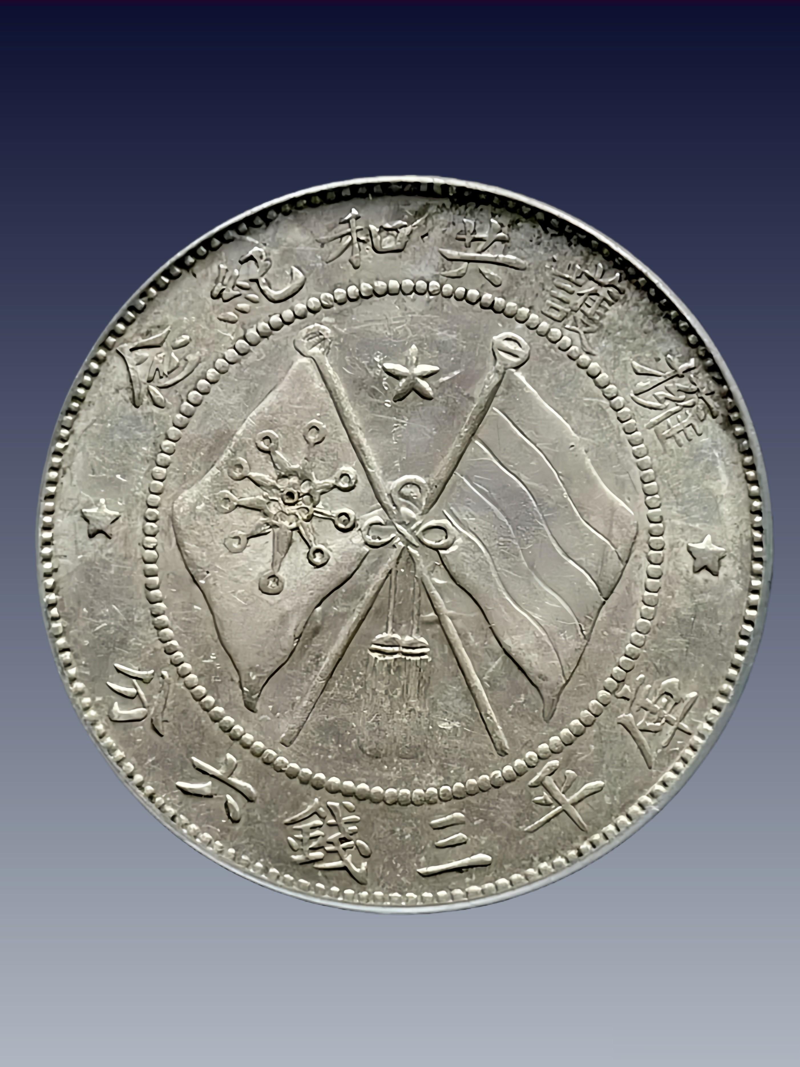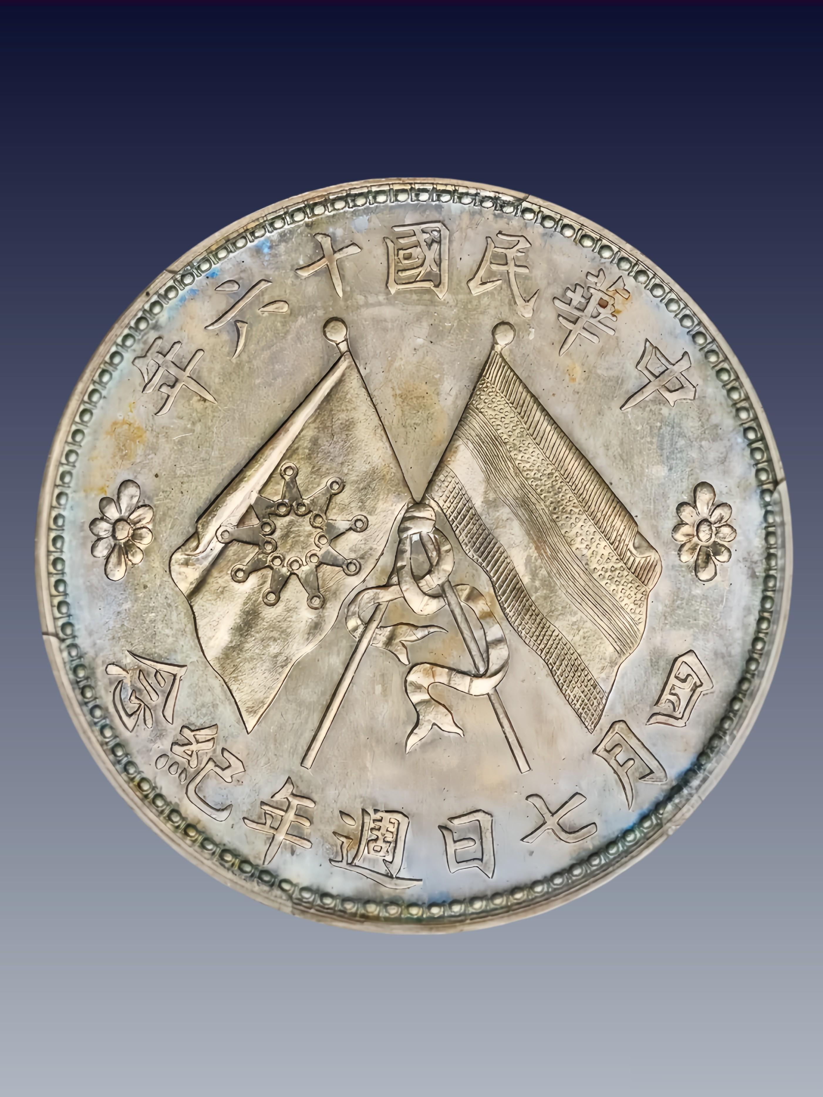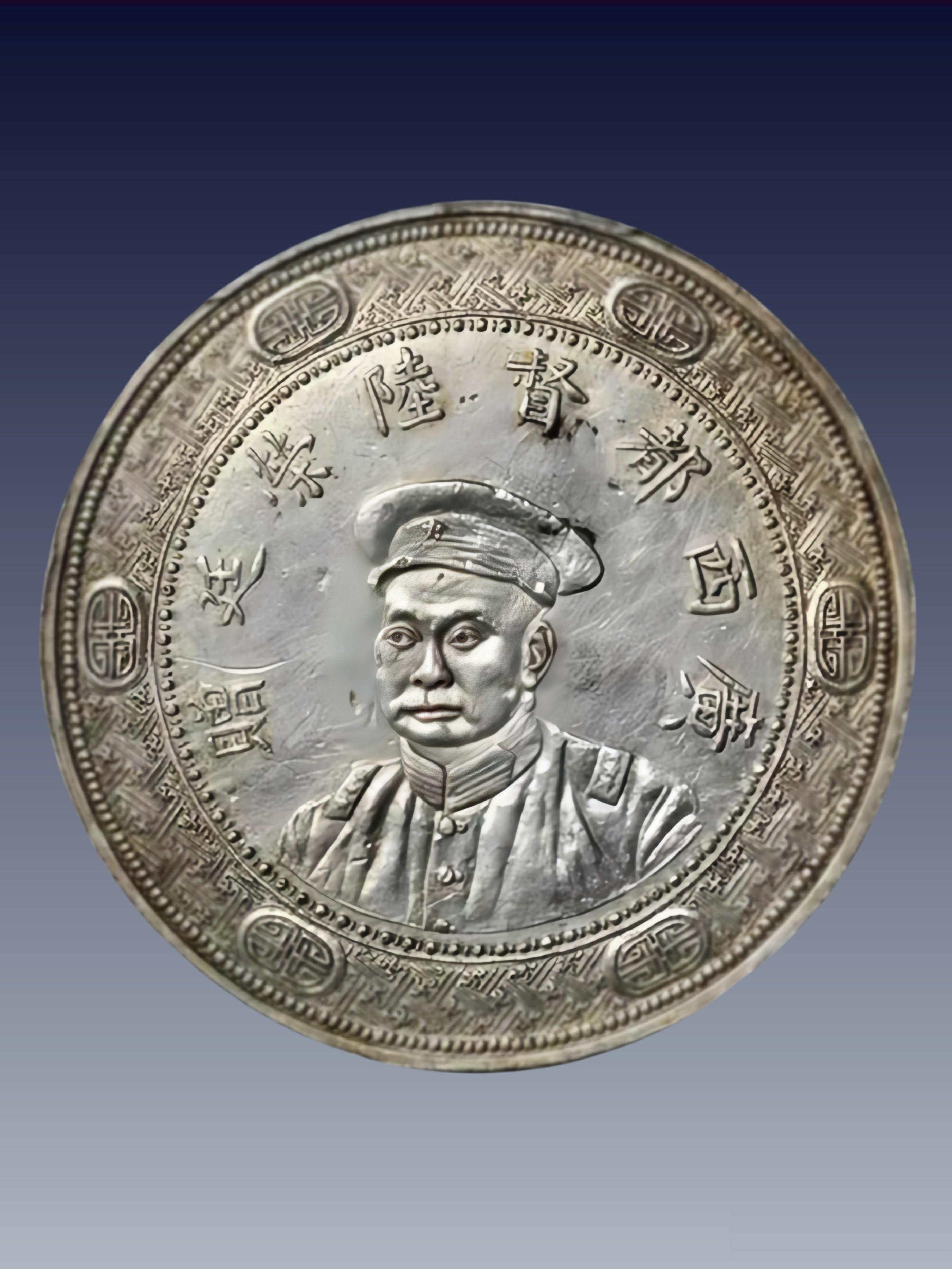◦ 背景:1916 年广西造币厂,银质,无面值赠章 / 壹圆规格银样(直径约 39mm,重约 26.8g,同壹圆银币)