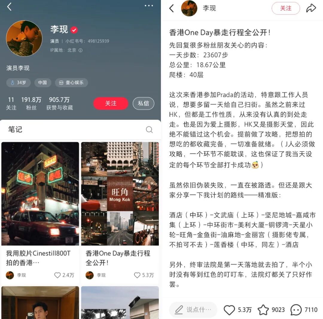 科林以李现和赵露思为例,李现作为资深的摄影爱好者,在小红书上经常会分享自己去各地拍摄的经历,最近爱上胶片机的他在香港扫街,还不忘回复大家关心的暴走步数与citywalk路线,仿佛是一位热心又细致、喜欢碎碎念的旅拍朋友。
