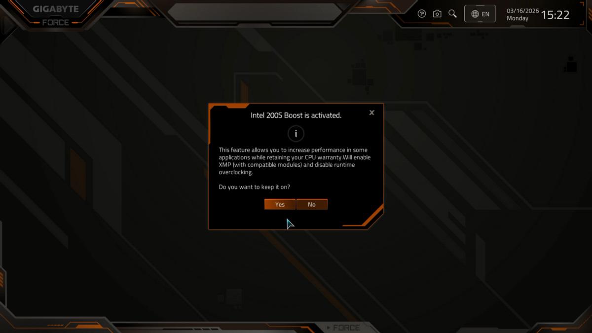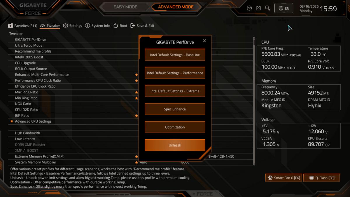 主板采用的是12+1+2相供电设计,搭配优质电感和固态电容,供电能力还是相当不错,就算是搭配最高加速功率达到250W的酷睿™ Ultra 7 Processor 270K Plus都能确保其火力全开。这次技嘉Z890M战鹰还增加了Ultra Turbo Mode,支持一键解锁隐藏性能,提供了LV1到LV3三个档位的模式,不同等级模式性能提升不同。同时主板在供电元件处还搭配了散热片,具备出色的热传导效率,让供电模块在持续高负荷状态下也有较低的工作温度。