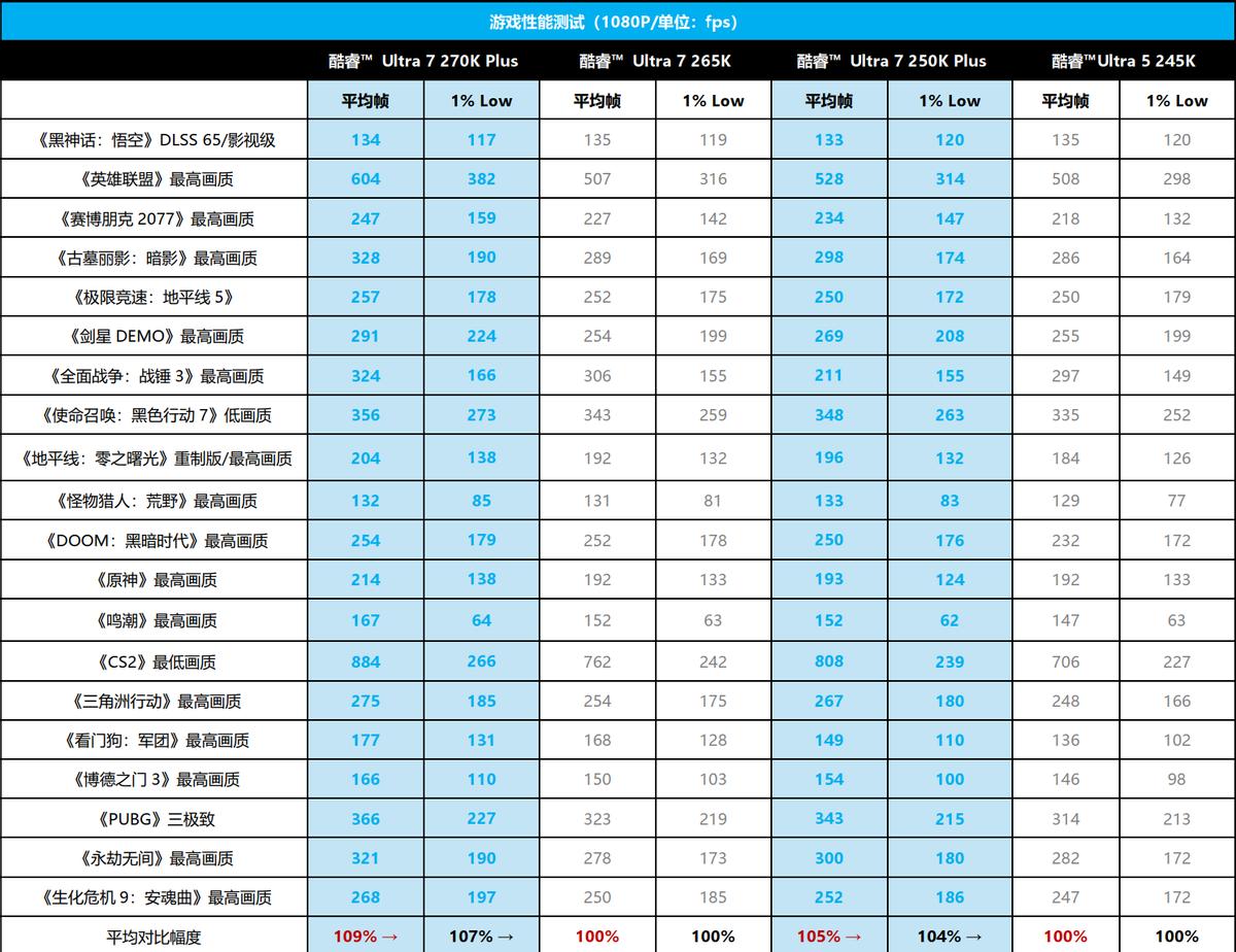 除了平均帧率的领先之外,我们还应该看到在1% Low表现上,酷睿™ Ultra 7 270K Plus和酷睿™ Ultra 5 250K Plus比上代产品分别提升了7%和4%,更好的Low帧表现意味着游戏流畅性的明显提升。总的来说,酷睿™ Ultra 200S Plus处理器在游戏性能上确实有了实实在在的提升。