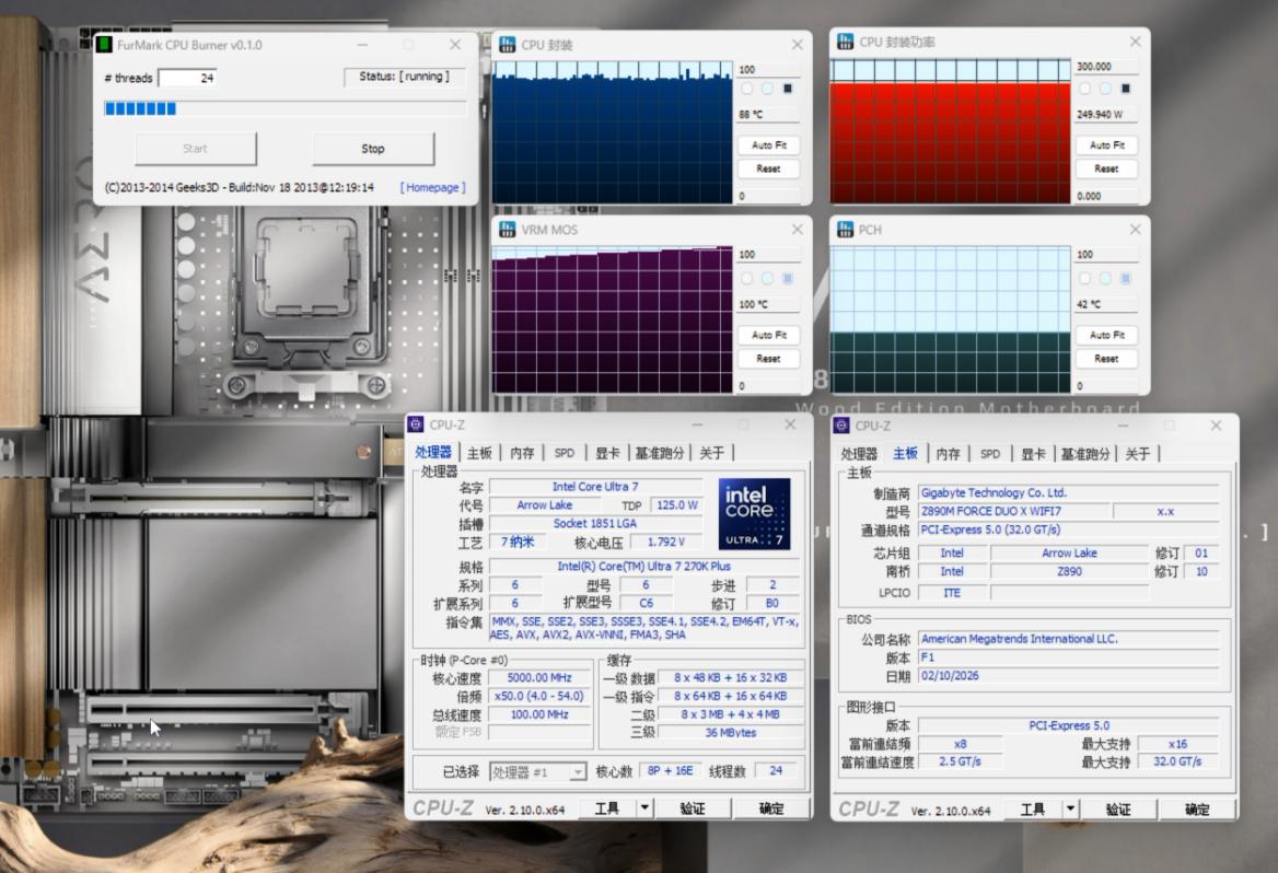 在室温22℃、解锁功率限制的情况下考机,酷睿™Ultra 7 270K Plus在技嘉Z890M战鹰主板上的满载封装功率最高大约250W,性能释放还是比较的充分,可见主板的供电配置还是非常的出色,可以轻松确保酷睿™Ultra 7 270K Plus全力输出。