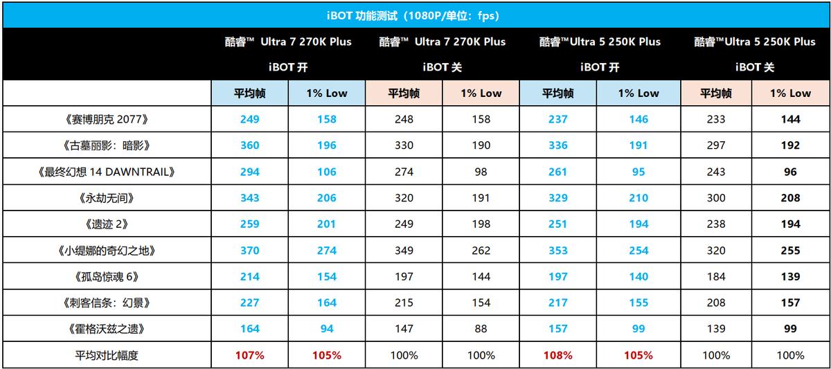 接着我们在APO工具中开启了iBOT功能,酷睿™ Ultra 7 270K Plus的平均游戏帧率提升了7%,其中在《霍格沃兹之遗》中,提升幅度最大达到了11%。酷睿™Ultra 5 250K Plus的表现相似,平均游戏帧率也有8%的提升。酷睿™ Ultra 7 270K Plus和酷睿™Ultra 5 250K Plus的表现也同样出色,都有5%的帧率提升。由此可见iBOT功能对游戏性能的提升立竿见影,游戏平均帧率提升明显,而且画面流畅性更为出色。