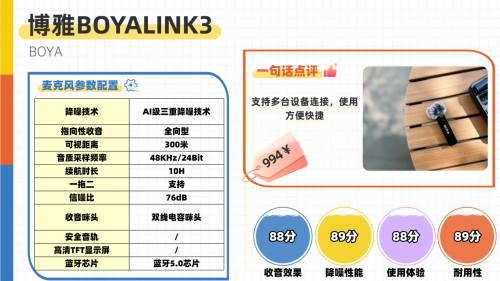 素材可通过USB-C直接导出,也能连接手机APP查看录制状态,操作简单易上手。整体来看,博雅BOYAMIC在音质表现与实用性上平衡出色,适合注重人声质感的入门创作者,不过对超远距离传输和多通道扩展有需求的专业用户,建议选择品牌高阶型号。