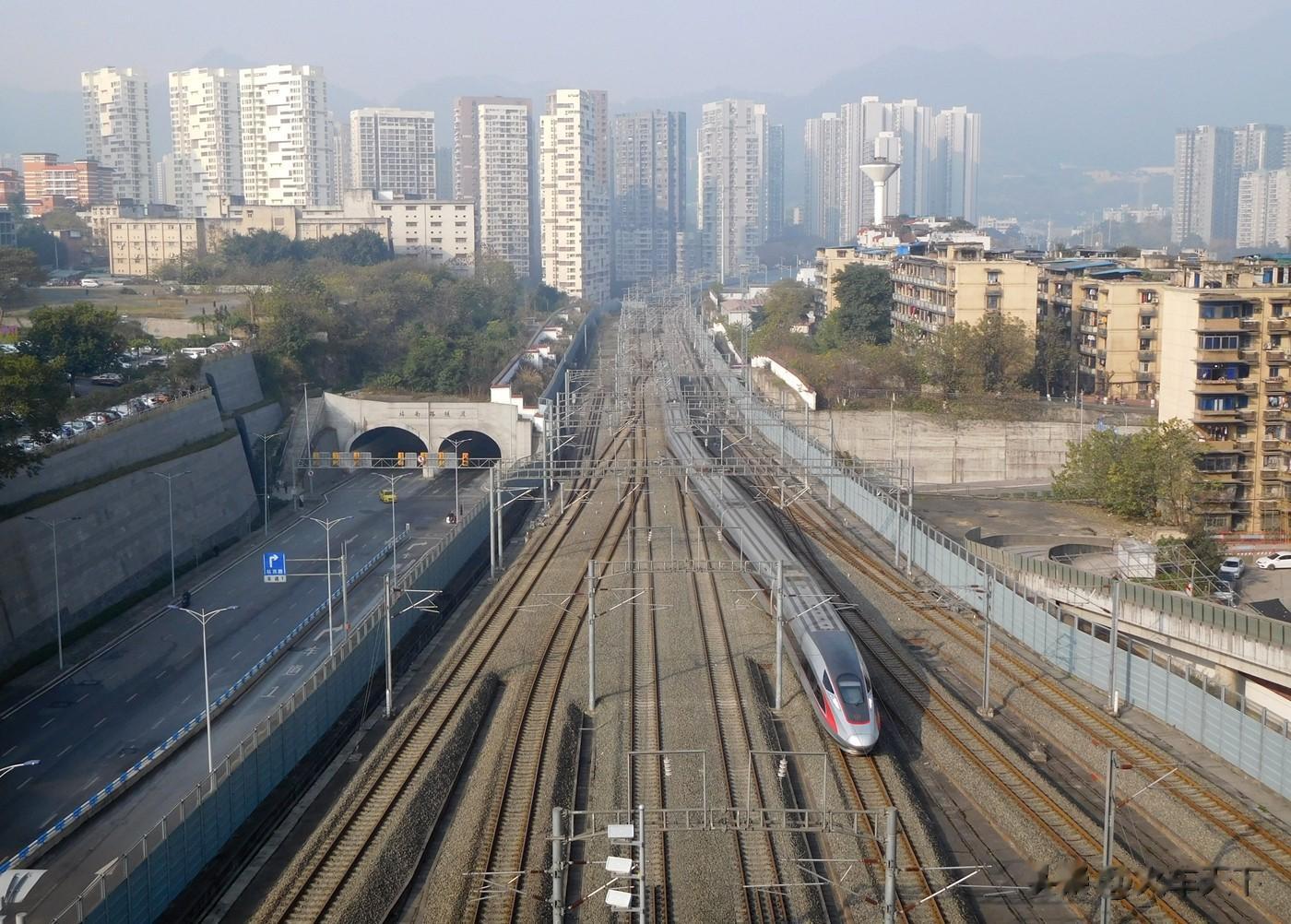 2020年底,随着成都铁路局配属复兴号CR400AF型动车组列车正式投入成渝高铁运用,该线最高运行时速达到350公里,从成都东到沙坪坝的复兴号G字头列车中途一站不停,全程62分钟到达。当然在成渝高铁能跑350公里时速的动车组只局限于成局的复兴号G字头列车。