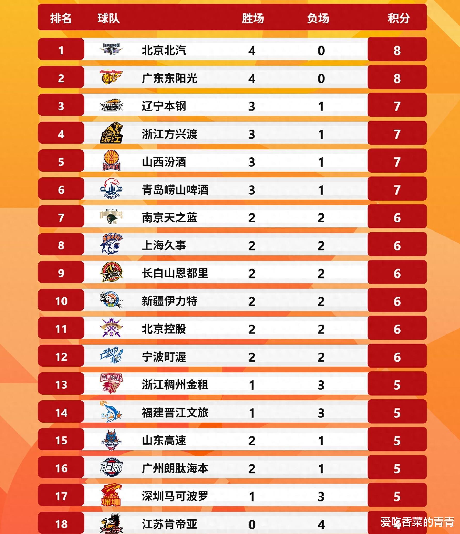 2025-2026赛季CBA常规赛第四轮战罢,积分榜格局风云突变,只剩下两支球队保持不败金身。北京首钢和广东男篮豪取四连胜,成为联盟中唯二的全胜球队,分列积分榜前两位。