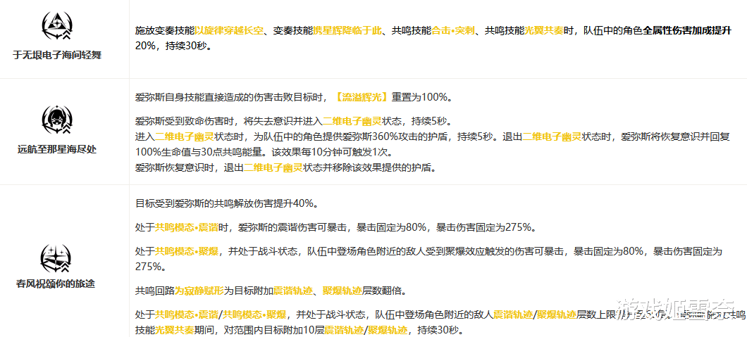 固有技能方面,优先点亮第二个,队友造成震谐相关伤害时提升爱弥斯爆伤20%,最高叠三层60%,聚爆相关伤害提升30%爆伤,最高两层60%,白嫖的爽爽吃!