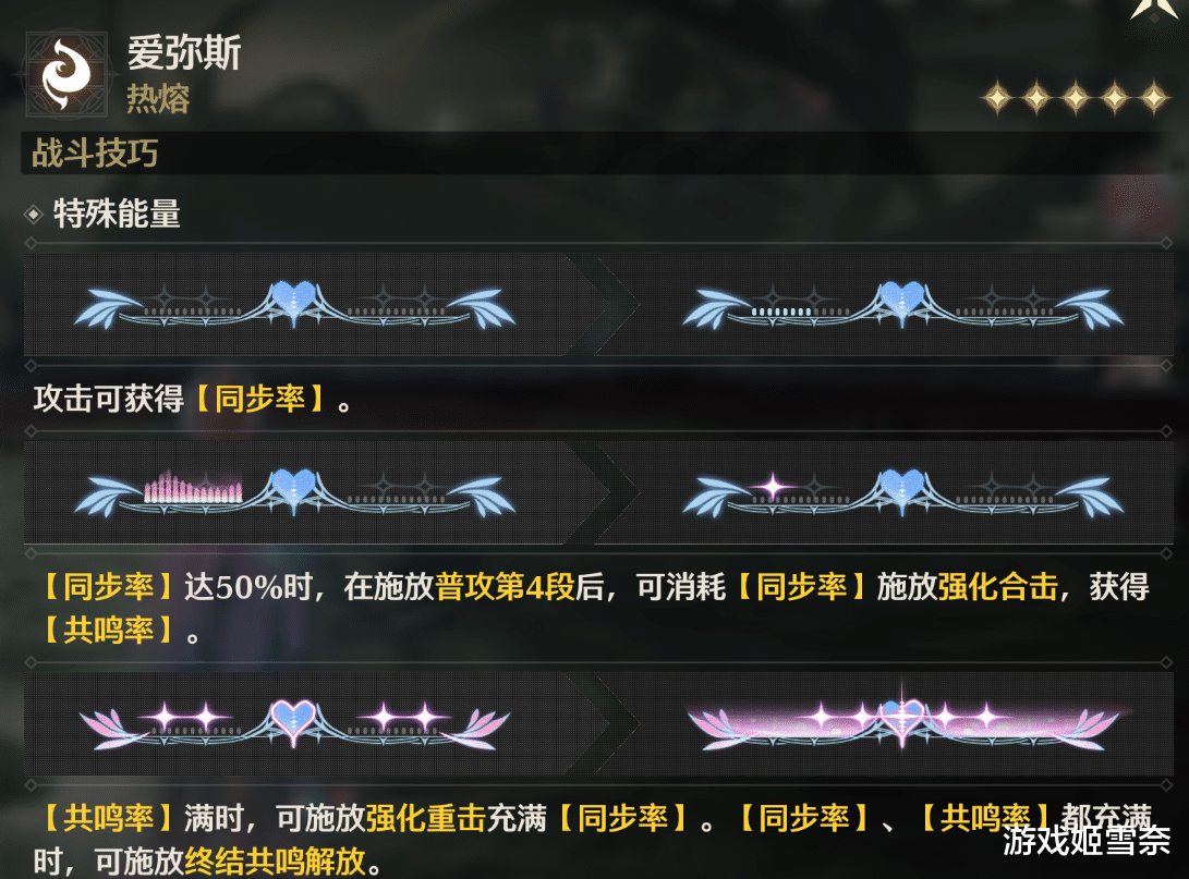 看人先看回路条,爱弥斯的回路条由下方的同步率和上方的星星形态的共鸣率构成,爱弥斯的玩法简单来说就是攒星星(共鸣率),星星满了释放强化重击充满双条开二段大招。所以如何获得星星就是弄清爱弥斯玩法的基础。