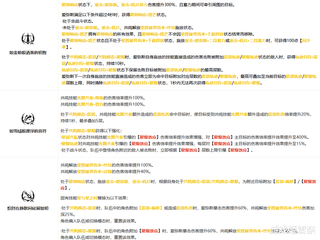 3链 两段大招倍率提升,满星状态下重击会根据携带的偏谐机制触发给敌人附加对应的效应,同时固有2替换为队伍造成偏谐效果爱弥斯直接获得60%爆伤和二段大25%增伤