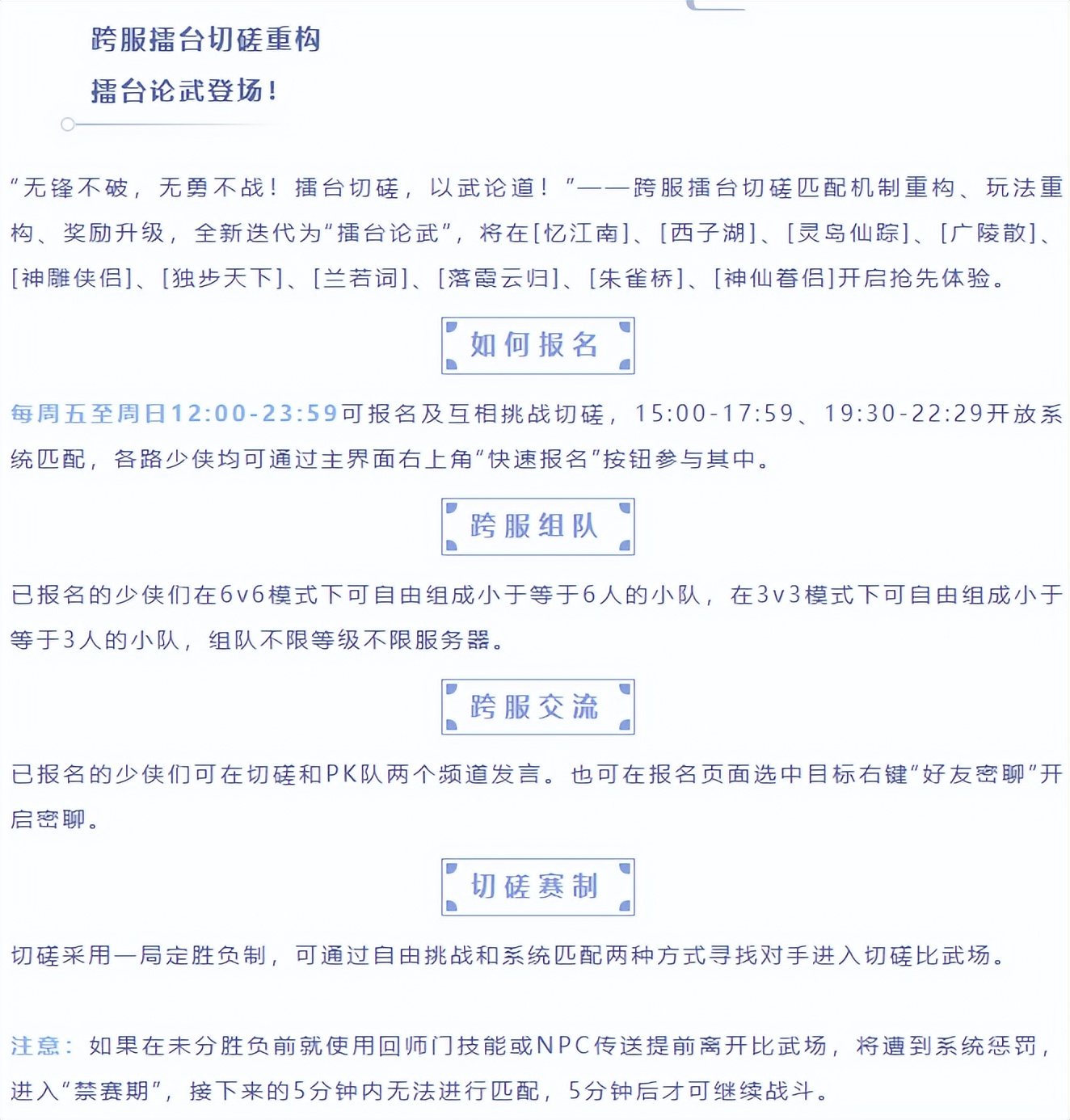 与此同时,经典的跨服擂台切磋玩法也已全面升级,“擂台论武”重磅来袭。新机制下你可以跨服组队交流,并在禁用所有额外属性加成、秘术和进阶技能的前提下展开竞技对战,最大程度地维持了战斗的乐趣与公平。“擂台论武”包括试锋场、藏锋场、无锋场、奇锋场等多个模式选择丰富。通过系统匹配参与切磋,取得连胜或打断对手连胜均可获得更多“擂斗分”,用以在擂斗商店和神秘商店中兑换各类珍稀好礼,有如此丰厚的奖励驱动,想必到时候的战斗必然是酣畅淋漓啊!