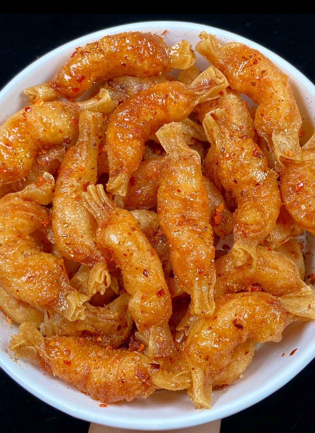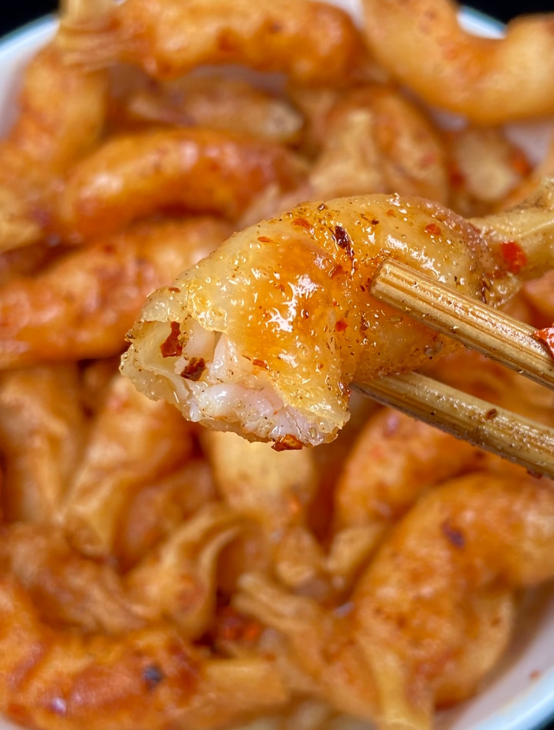 最后,趁热撒上灵魂所在的椒盐与辣椒粉,热气能将香料的香气瞬间激发,均匀附着在每一道皱褶上,至此,从质朴虾仁到风味“糖果”的华丽蜕变,才算完成。