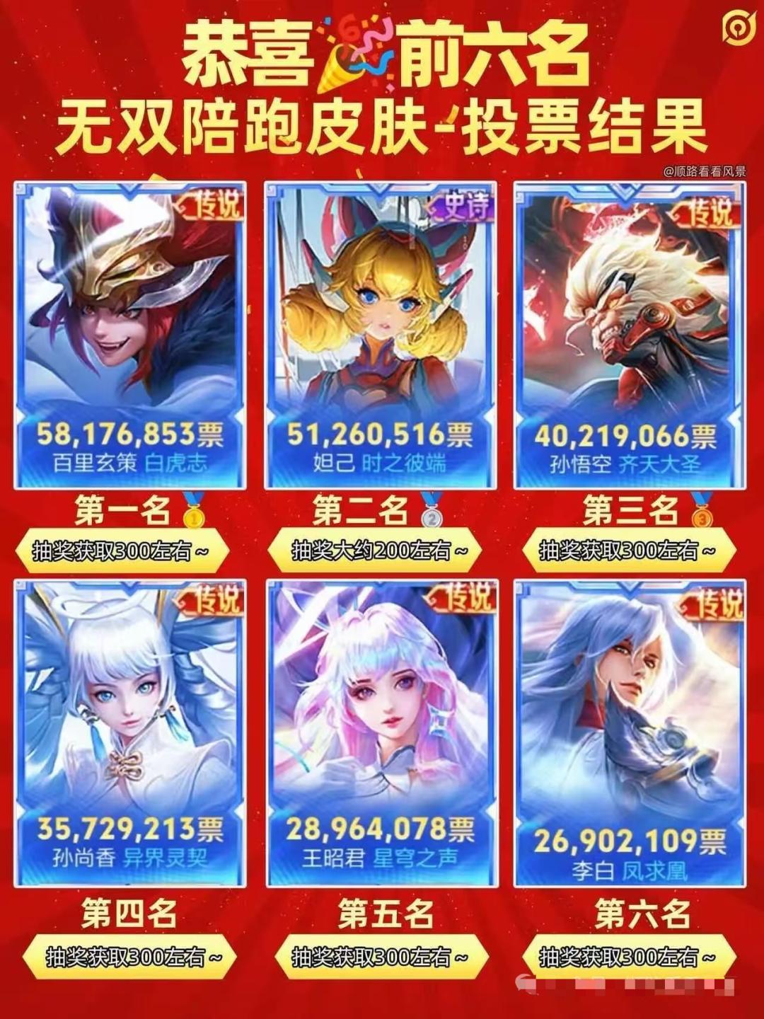 返场投票结果早出来了:白虎志(6023.6w 票)、时之彼端(5312.6w 票)、齐天大圣(4175.1w 票)、异界灵契(3713.5w 票)、星穹之声(3015.9w 票)、凤求凰(2802w 票),这 6 款全靠 “无双祈愿” 返场。参考之前的池子,传说限定保底3000-3500点券,史诗1500-2000!