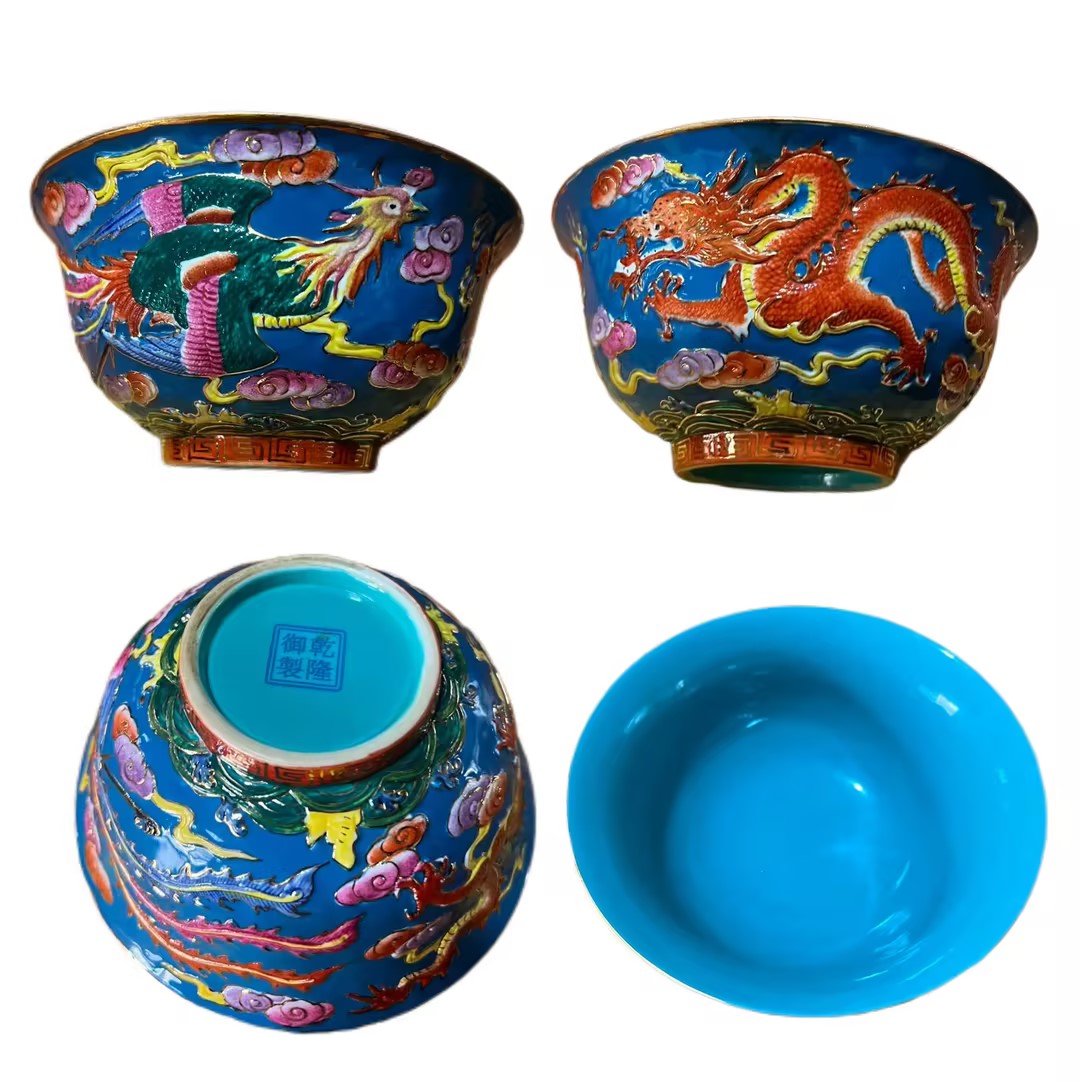 当这对口径 15.5 厘米、高 8 厘米的龙凤碗出现在视野中,宝蓝地色上的浮雕龙凤与描金流光,早已超越 “古瓷” 的范畴 —— 它是 “材质稀缺性、工艺壁垒、文化权重、流传稀缺性” 共同构筑的价值金字塔,每一层都写着 “不可替代”,最终沉淀为 “中国古瓷顶级标的”。