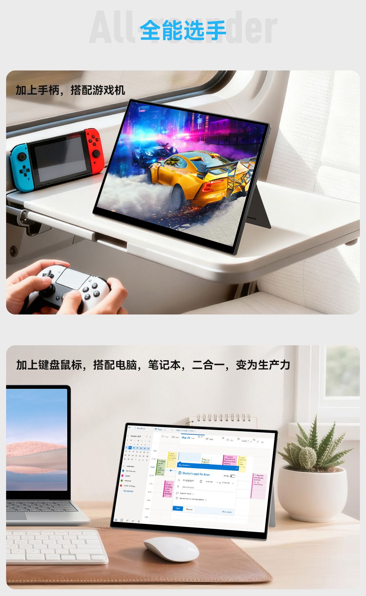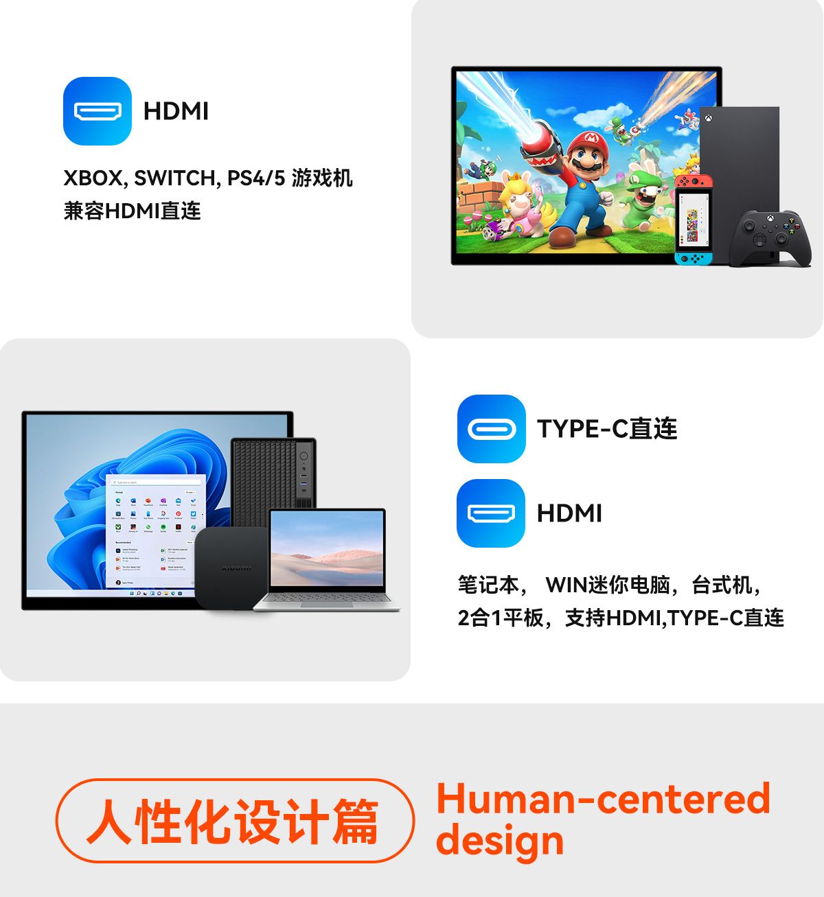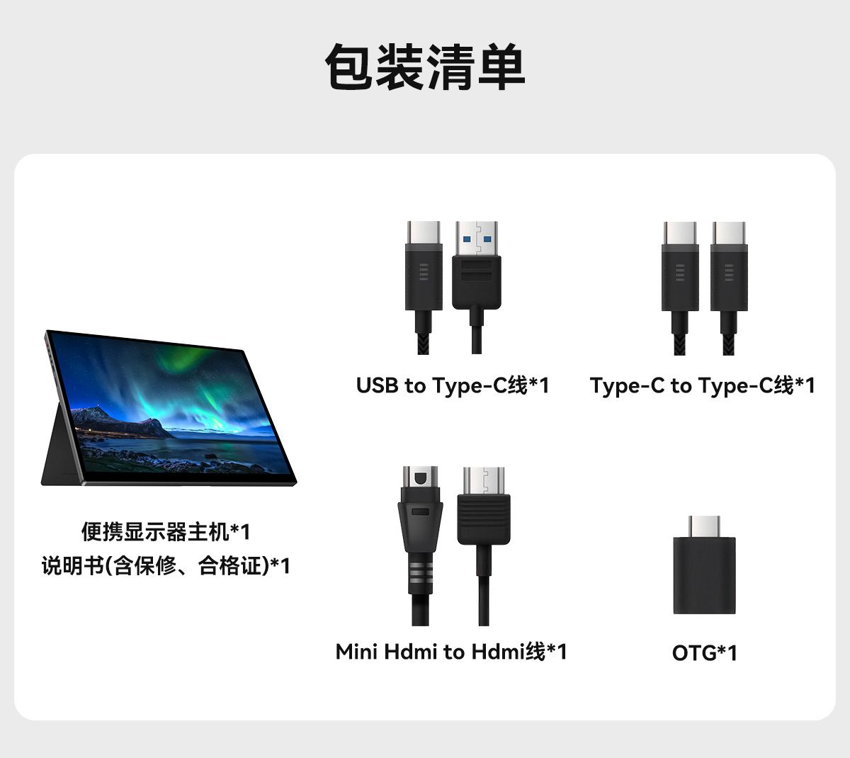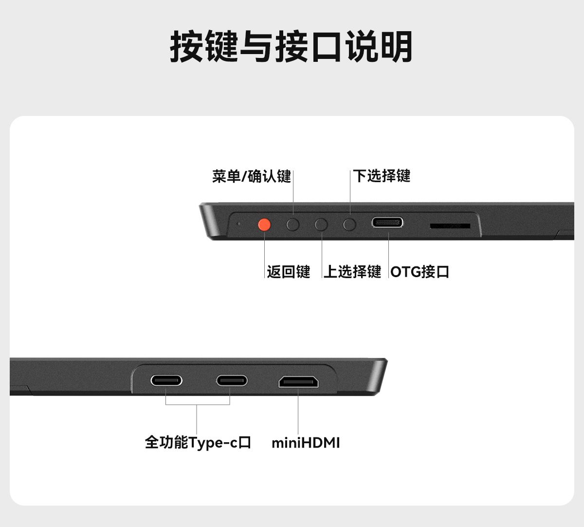 视频接口: 配备2个全功能Type-C口(支持一线通视频传输与供电)和1个Mini-HDMI口。OTG扩展: USB 3.2接口可轻松连接键盘、鼠标、U盘等外设。广泛支持: 全面兼容Windows系统的台式机、笔记本、迷你主机;支持任天堂Switch、索尼PS4/5、Xbox等游戏机;支持华为、三星、小米等众多品牌的安卓手机/平板的PC模式或HDMI输出。重要提示: macOS及iOS系统仅支持视频输出,不支持触控功能。上市信息与首发活动海乐思S123E触控便携屏已定档发布:
