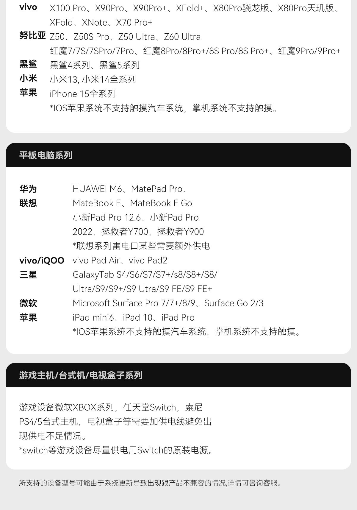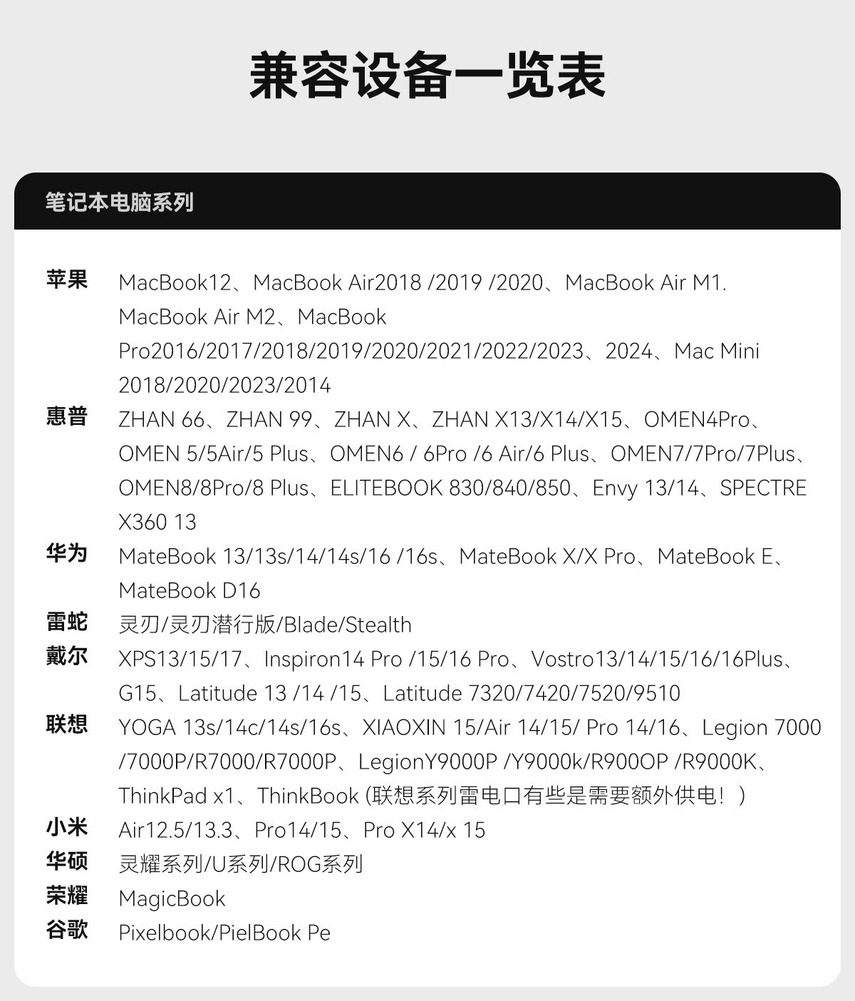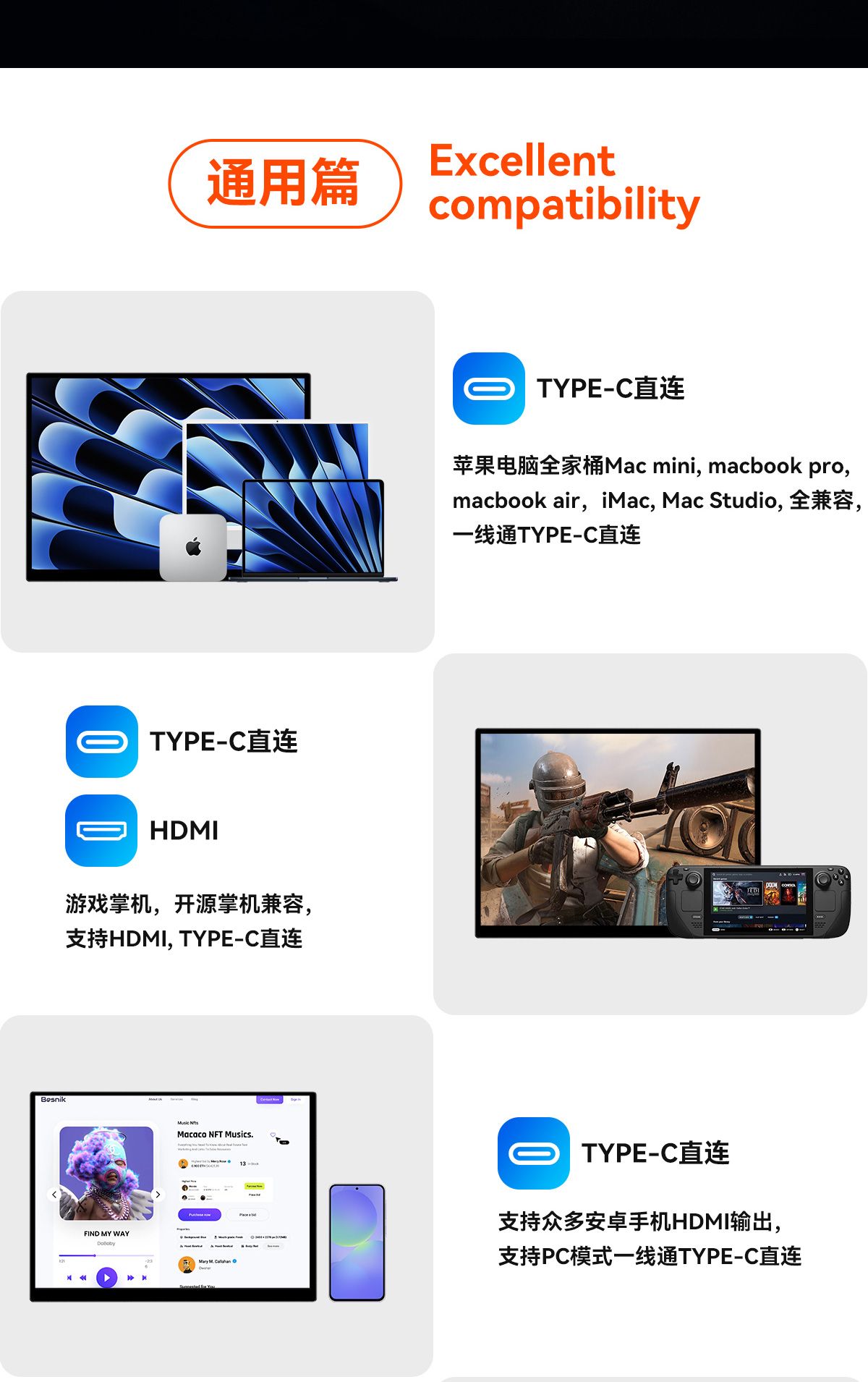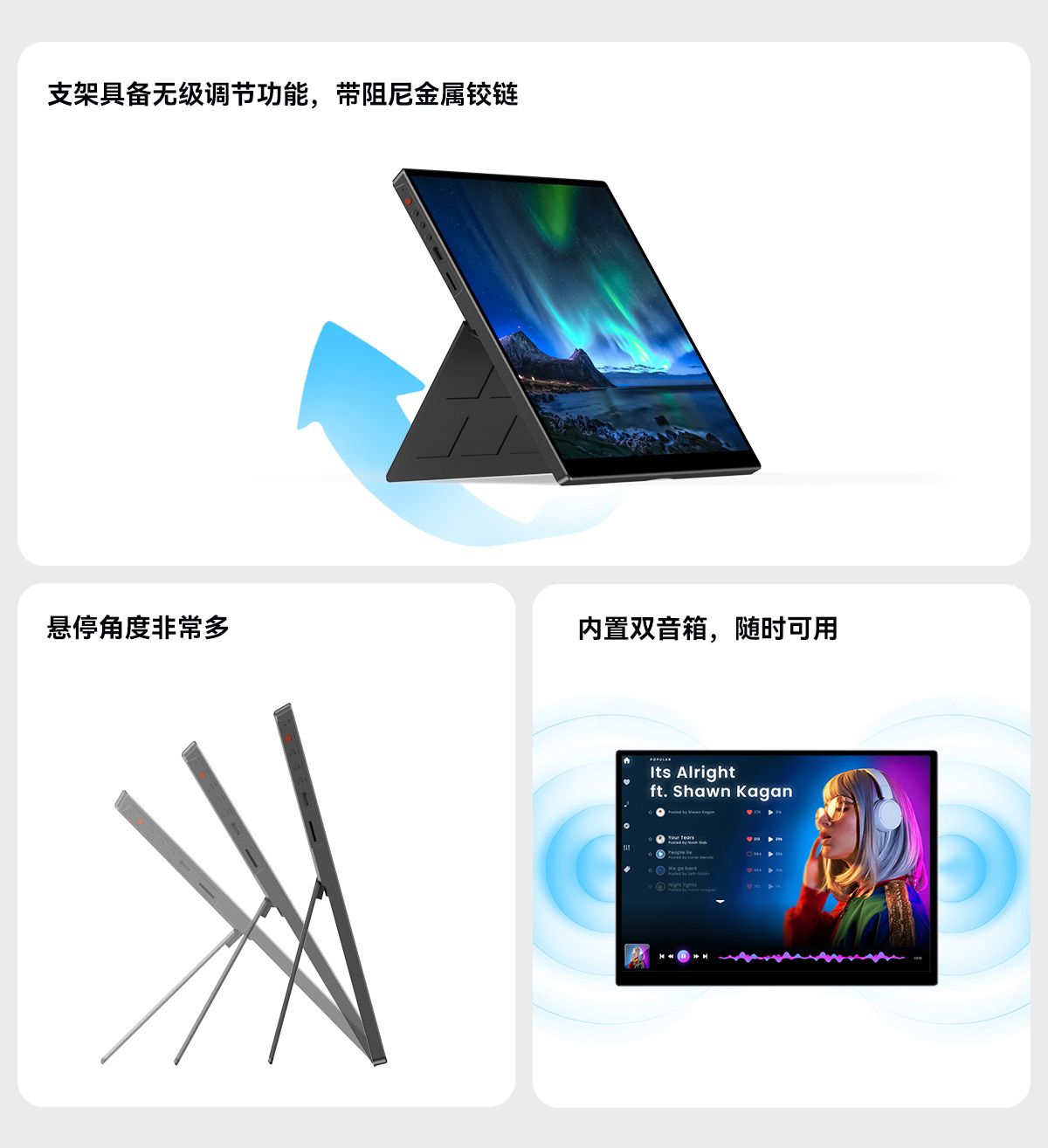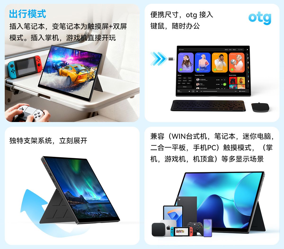 视频接口: 配备2个全功能Type-C口(支持一线通视频传输与供电)和1个Mini-HDMI口。OTG扩展: USB 3.2接口可轻松连接键盘、鼠标、U盘等外设。广泛支持: 全面兼容Windows系统的台式机、笔记本、迷你主机;支持任天堂Switch、索尼PS4/5、Xbox等游戏机;支持华为、三星、小米等众多品牌的安卓手机/平板的PC模式或HDMI输出。重要提示: macOS及iOS系统仅支持视频输出,不支持触控功能。上市信息与首发活动海乐思S123E触控便携屏已定档发布: